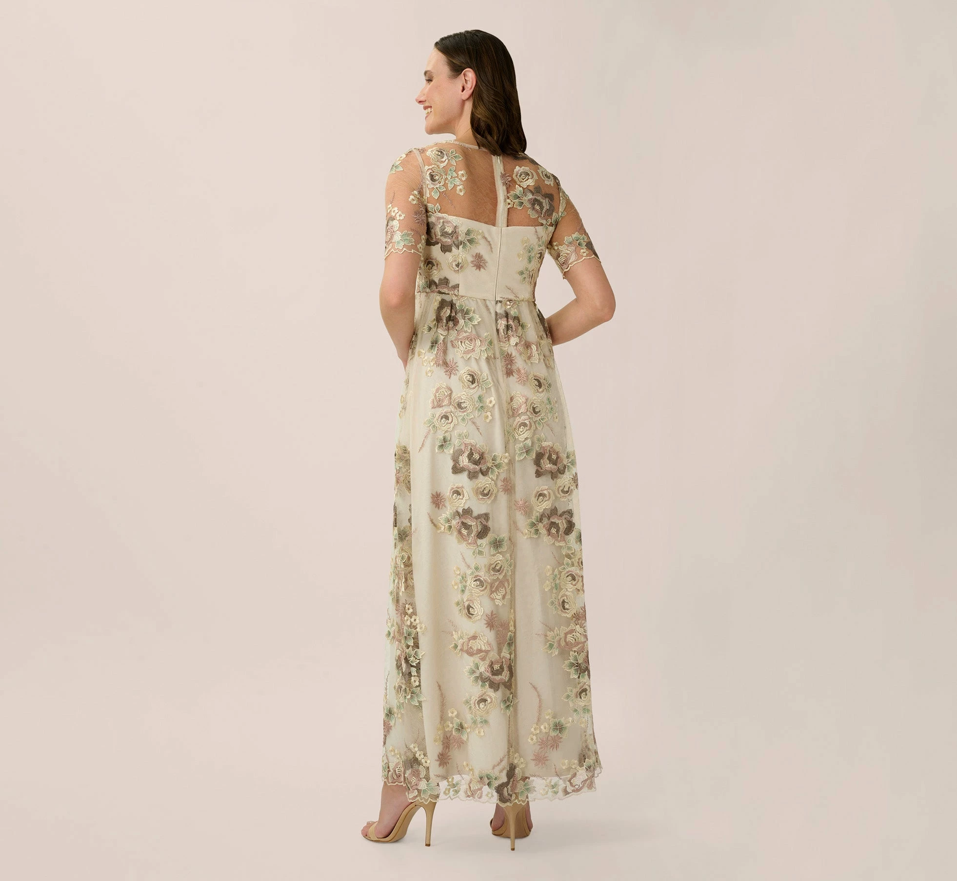 Demure and romantic, this long lace gown is embroidered with vintage inspired rose bouquets. Designed in a stunning curve-skimming silhouette, this A-line dress also features pretty scalloped edging, a sheer boat neckline, back and sleeves. Complement this ultra-feminine look with pretty satin pumps.