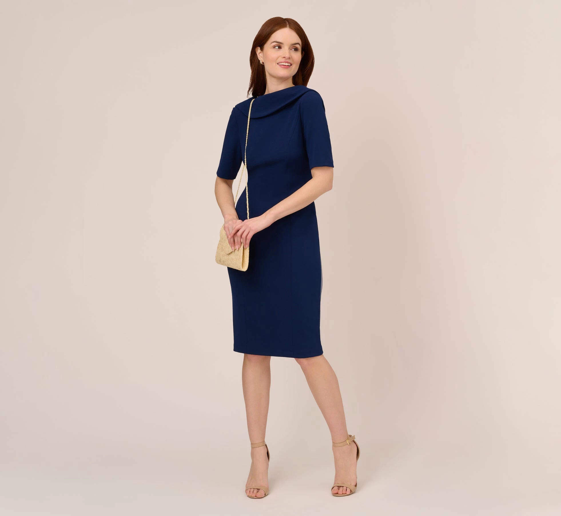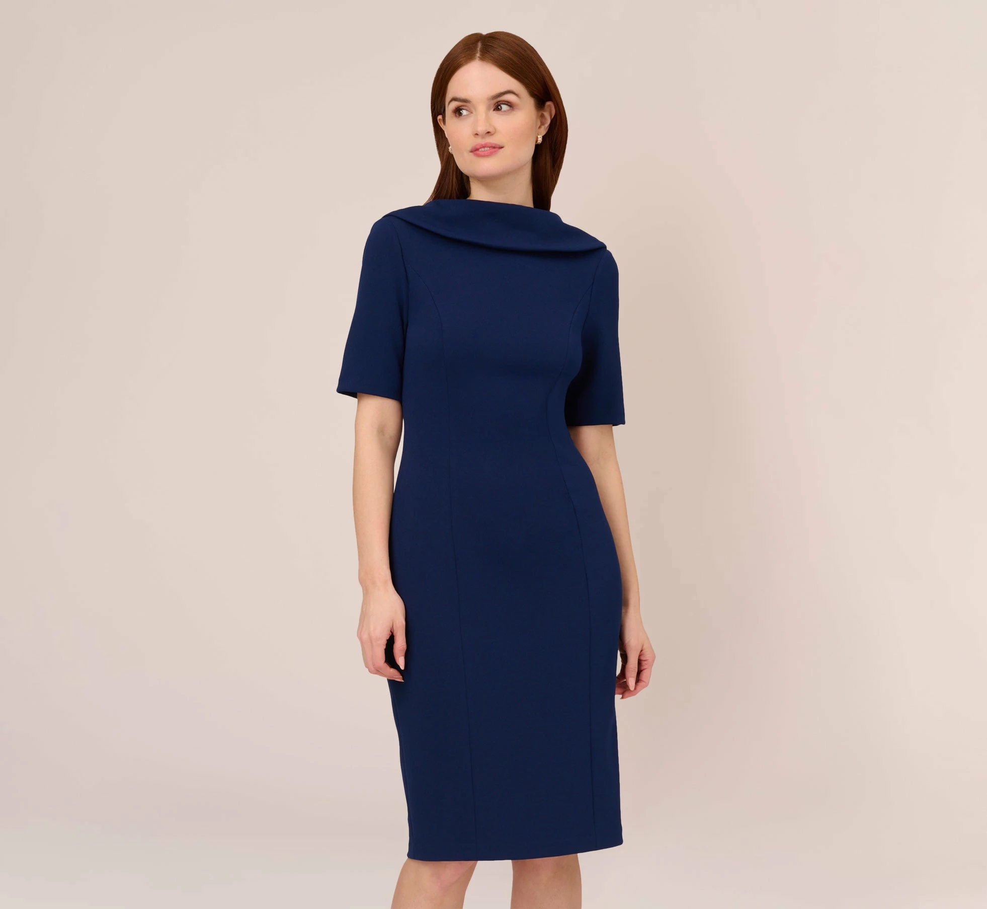 A sophisticated look from work to cocktail hour begins with this short sleeve dress. This crepe dress features short sleeves, a v-back, and a rolled neckline. This midi dress is crafted from stretch crepe fabric for a comfortable look that will last you all day. Style this dress simple pointed pumps for a work appropriate look. Swap them with a strappy heel to transition this short sleeve dress to happy hour or date night.