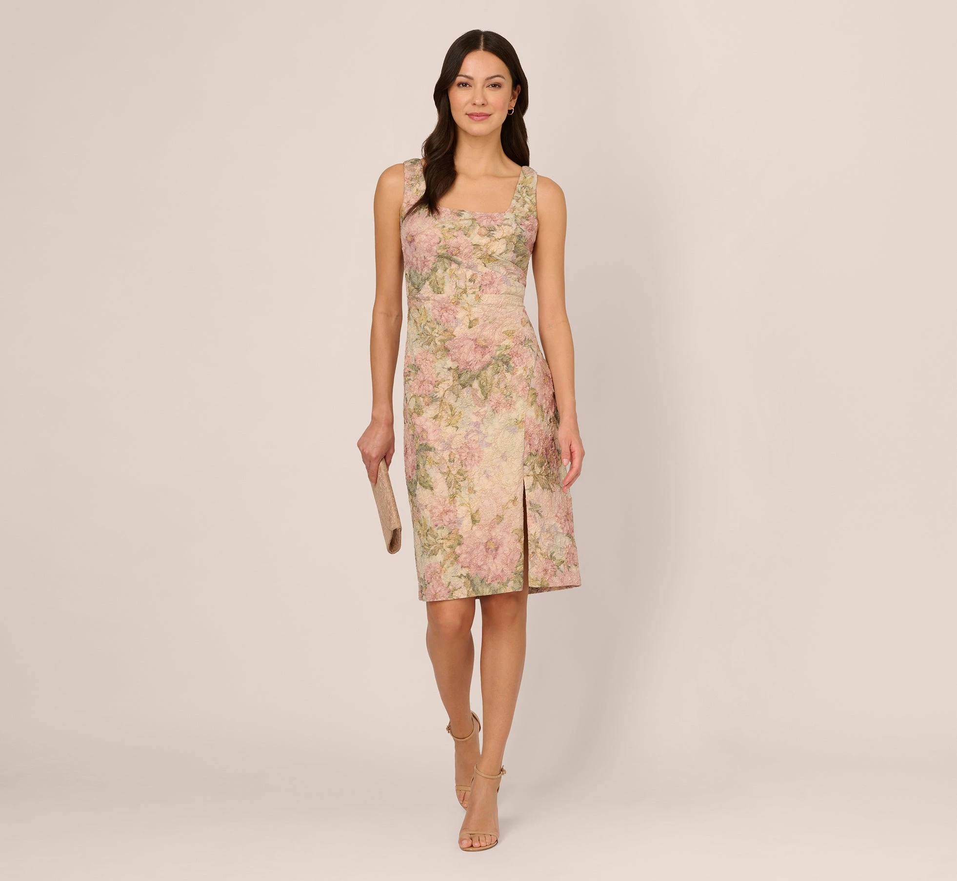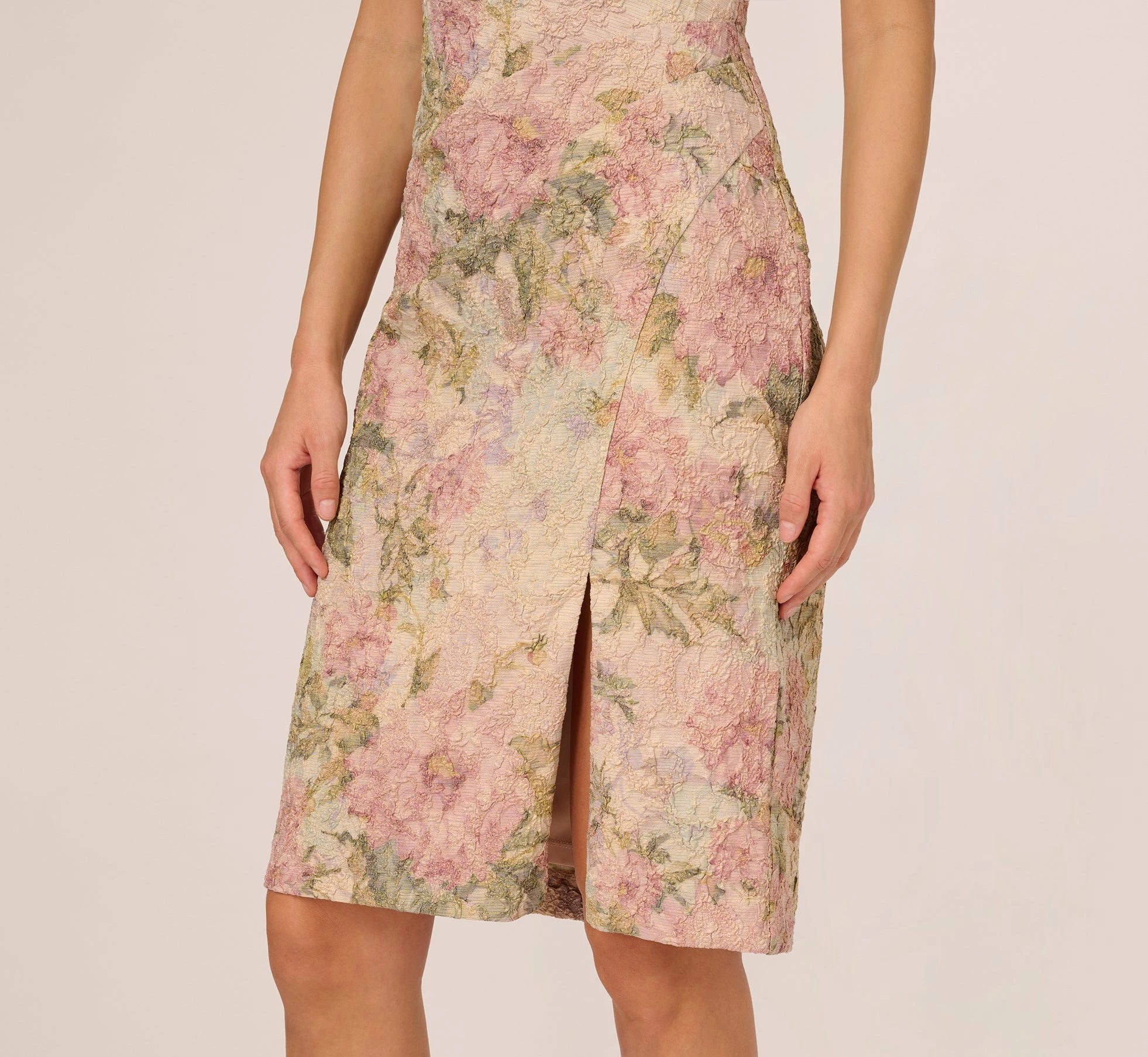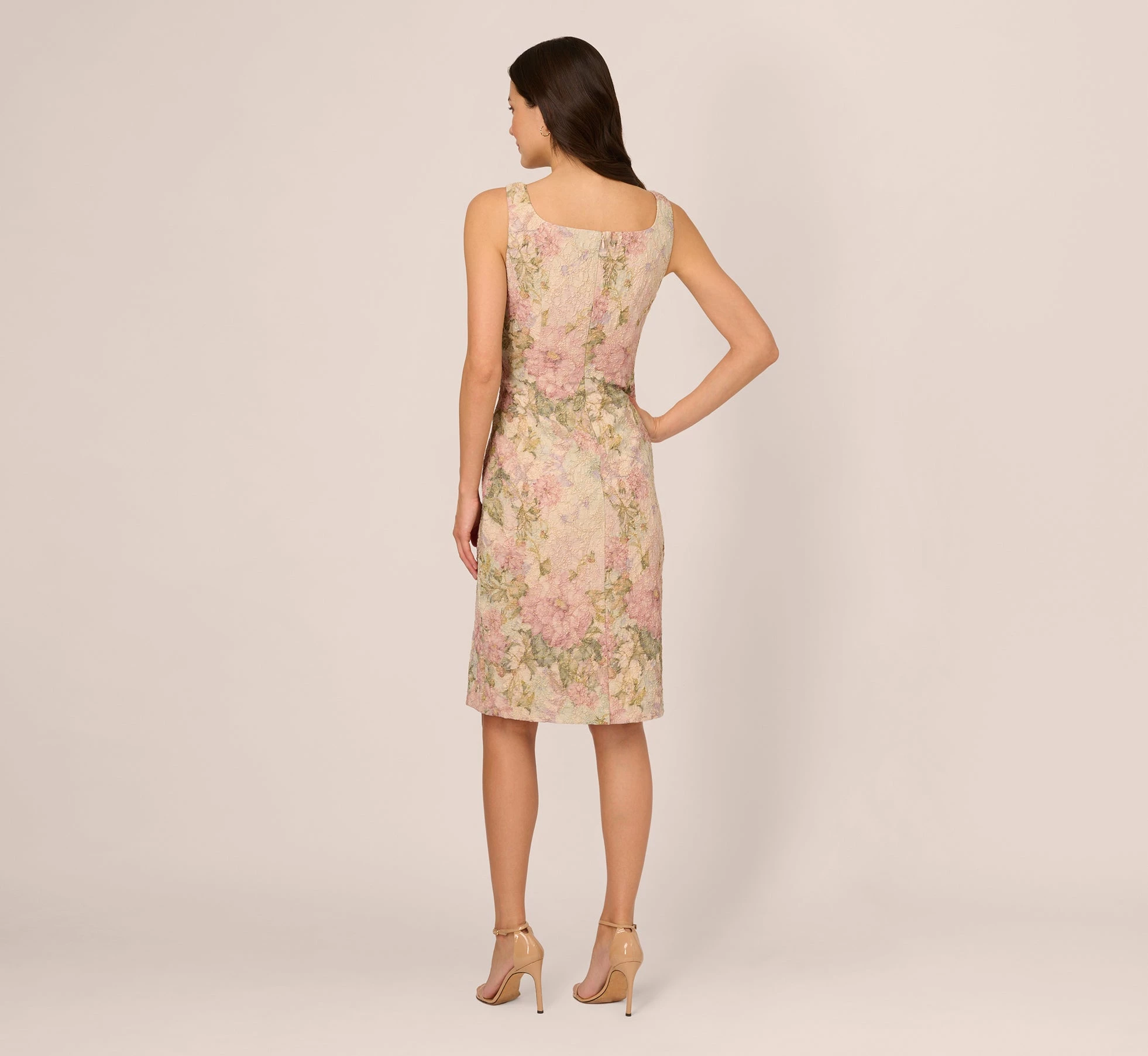 Adrianna Papell Sleeveless Floral Matelasse Sheath Dress With Pleated Details In Rose Multi