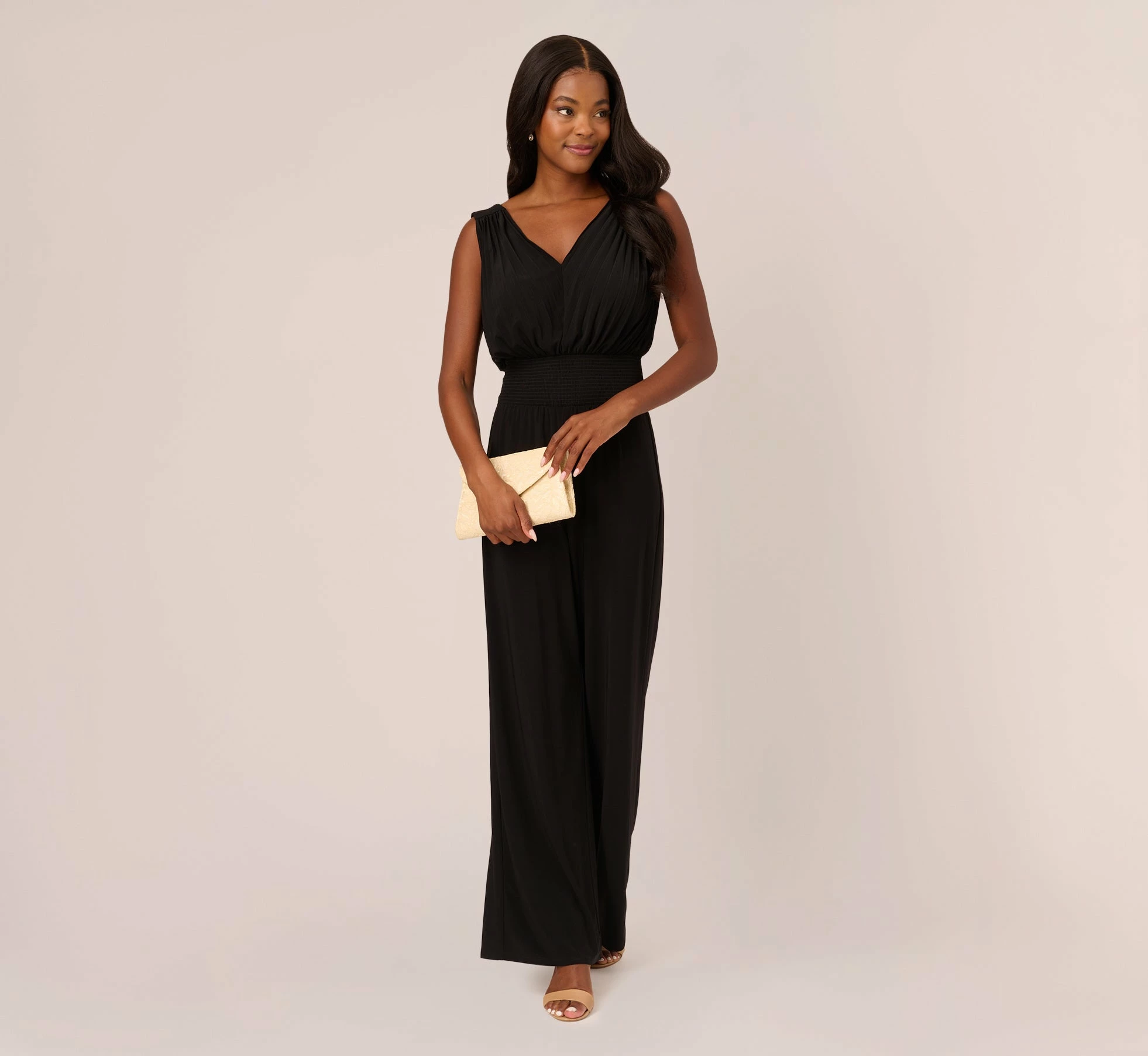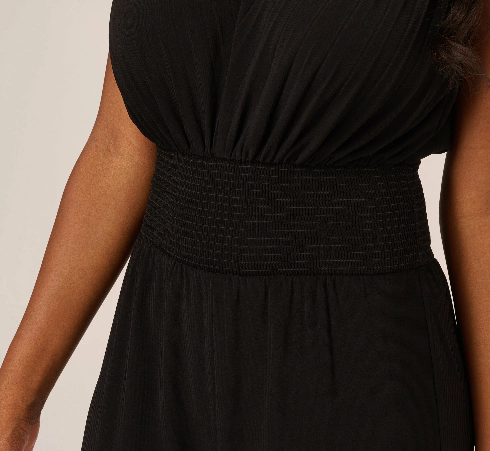 Day or night, this jumpsuit is a look that you’ll love finding new ways to wear. This sleeveless jumpsuit features a pleated bodice with v-neckline and back, a smocked waist, and wide leg pants. Crafted from mixed fabrications for a contrasting look, this pull-on jumpsuit will be themost comfortable style in your closet. Styled with metallic accessories, this jumpsuit is perfect for a wedding, or top it with a blazer to shine during a day at work.