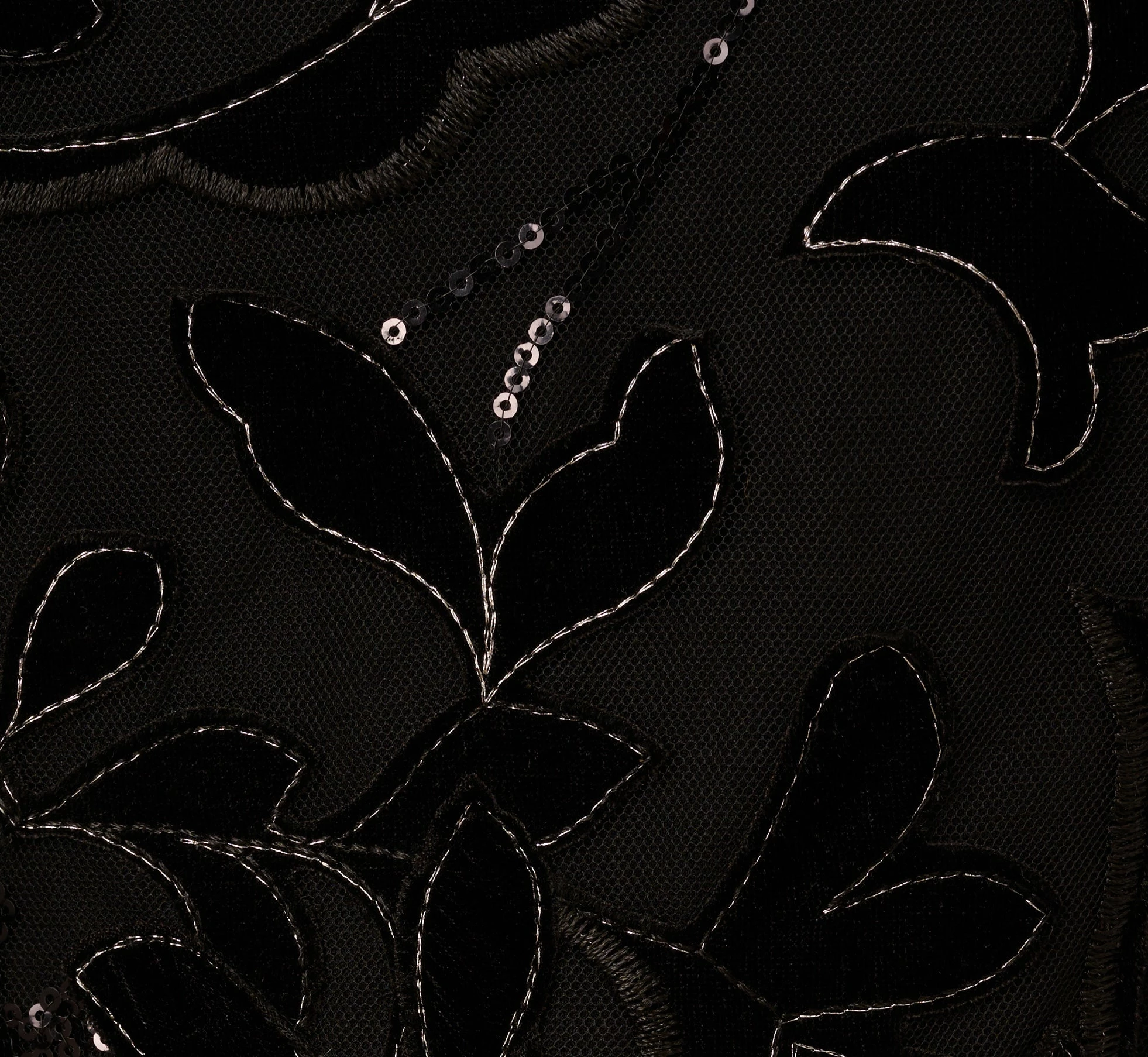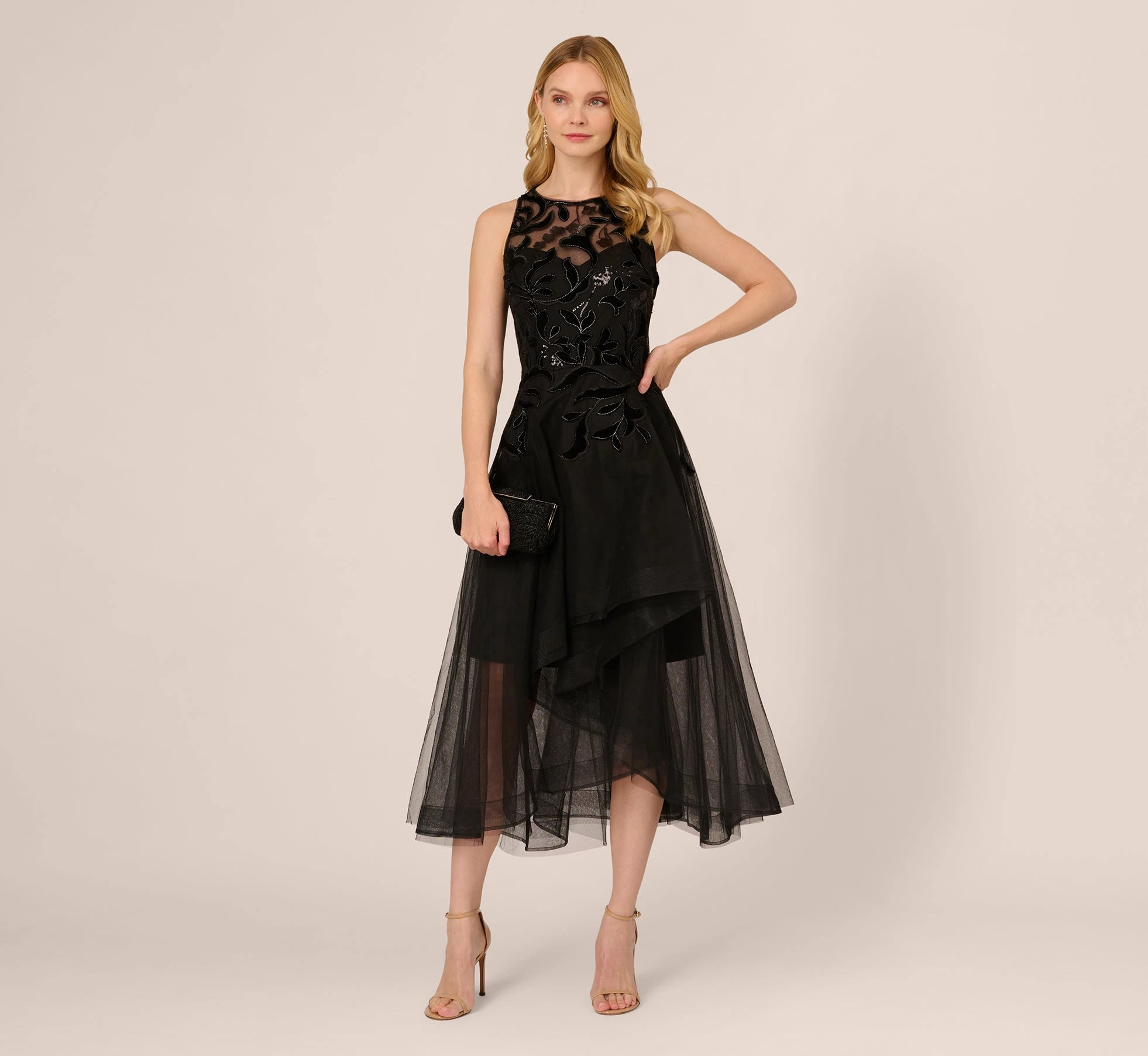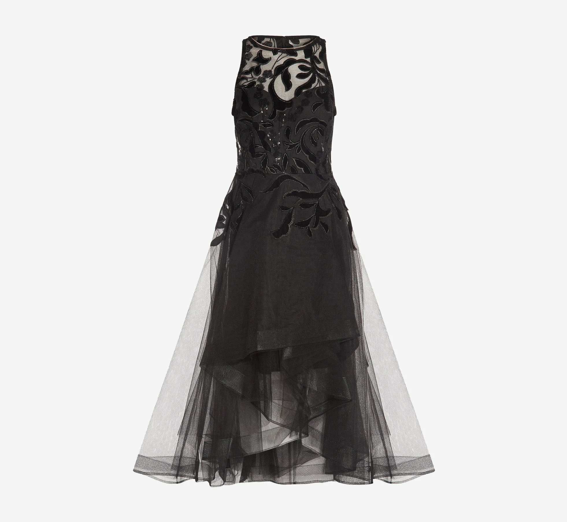 Sophisticated and chic, a striking halter party dress in rich refined velvet and ethereal tulle, embroidered with an elegant velvet appliqué at the illusion mesh bodice. Details We Love: the festive high low hem and sleek sleeveless silhouette.