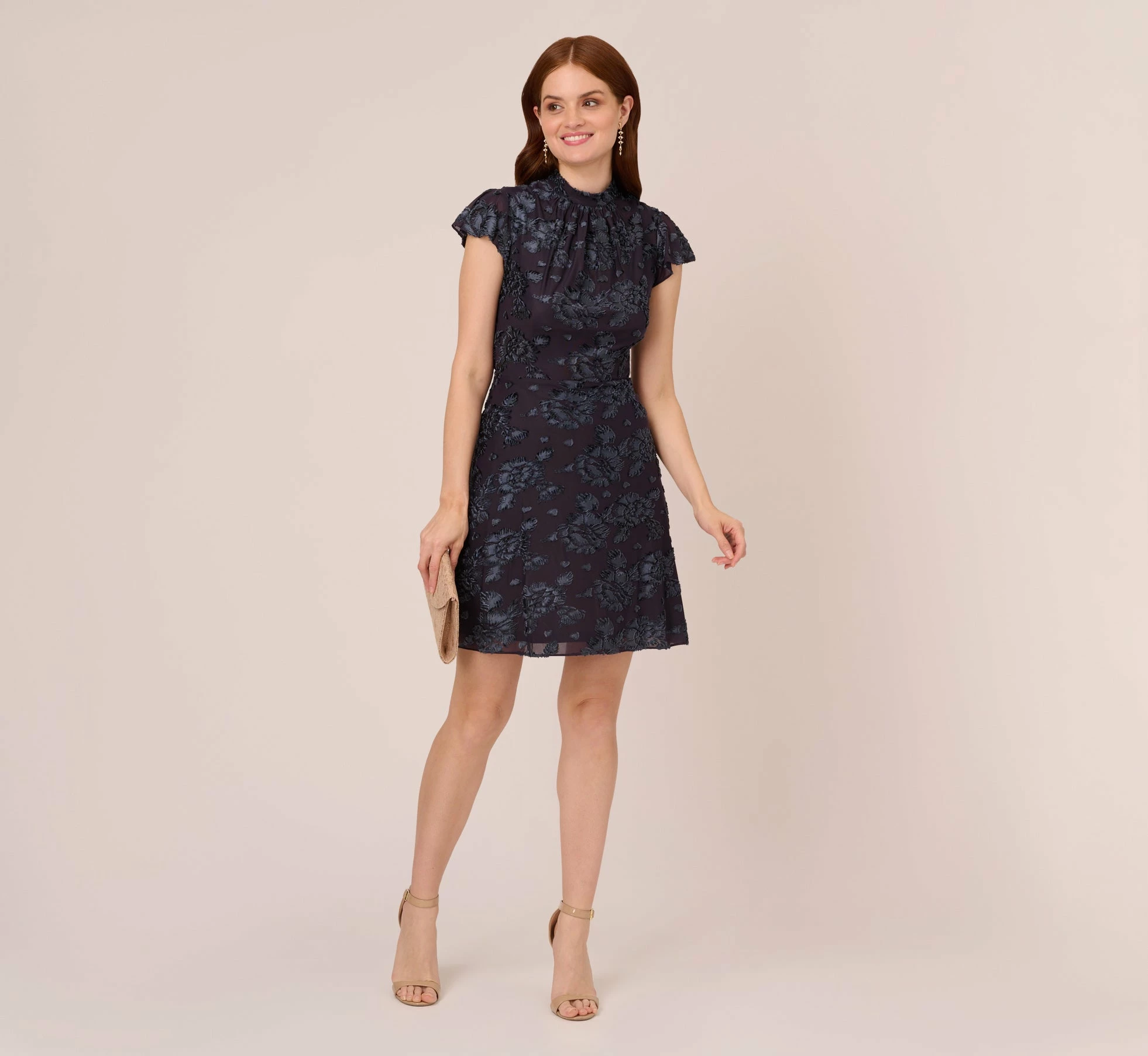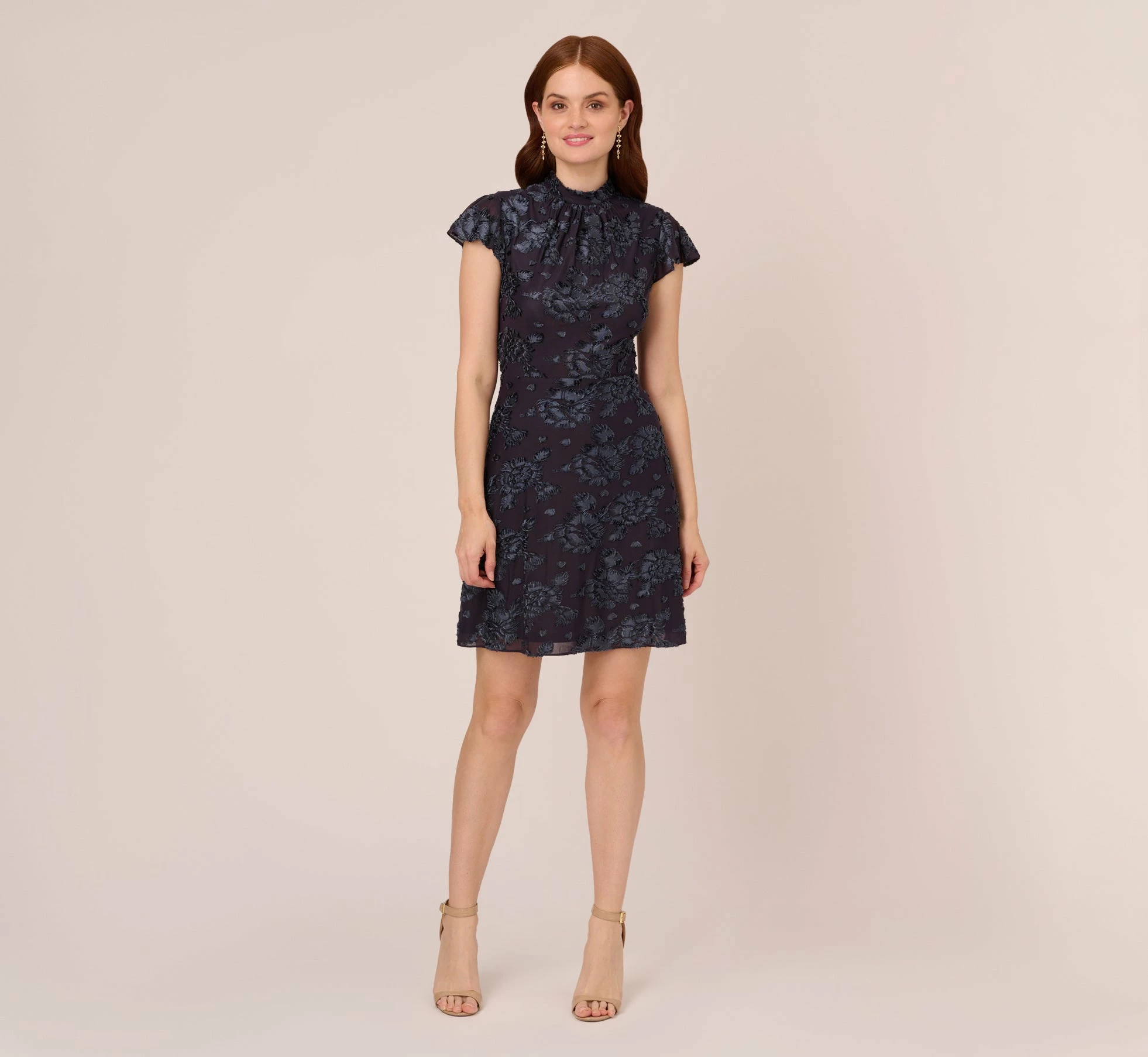 Beautiful blooms and rich fabric are the highlights of this timeless dress. This A-line dress features a fitted bodice, short sleeve, and a mock neck with pleated details. Crafted from burnout velvet with rosette designs, this sweet, mid-length dress is a pretty look. A zipper closure at the center back completes this velvet dress. Style this short sleeve dress with neutral heels and statement earrings for a look that will sparkle from the office through date night.