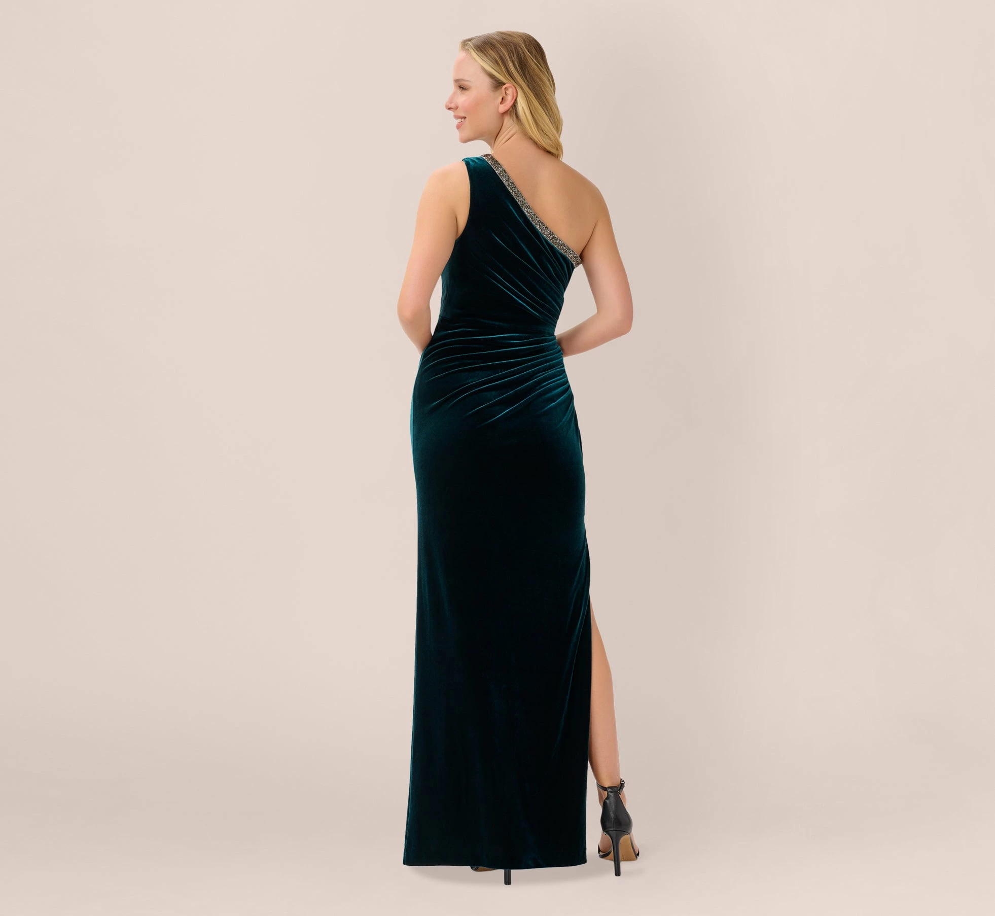 Subtle sparkling details are the prettiest, and this velvet gown is no exception. This formal dress features a one-shoulder neckline adorned with beaded trim, a column skirt, and gathered details at the side that drape down the body. Designed with a soft, luxe velvet, this column gown hasplenty of shine. A zipper closure at the side of this one shoulder dress completes the look. Add metallic high heels and a sparkling clutch to finish this black-tie gown off.