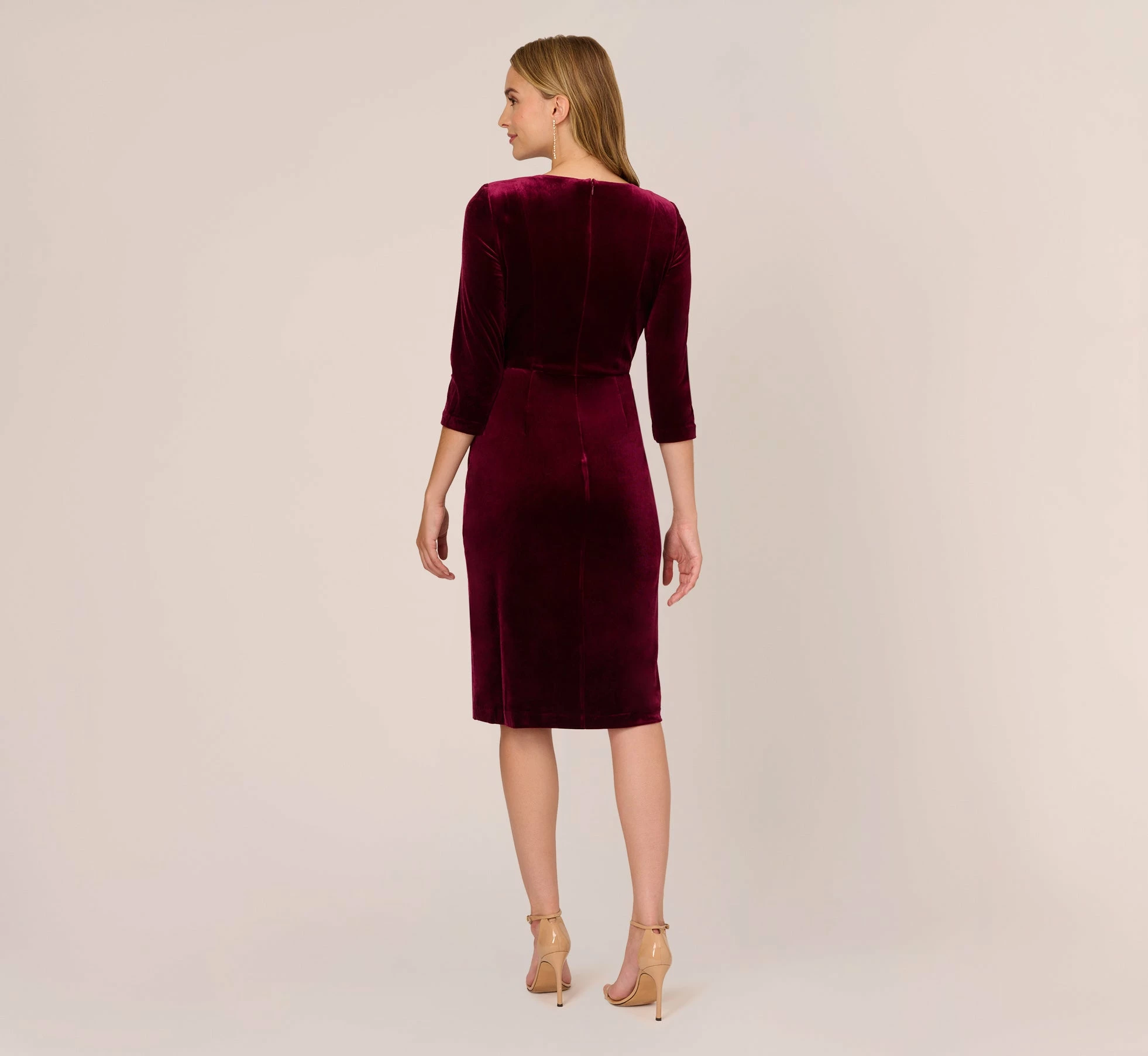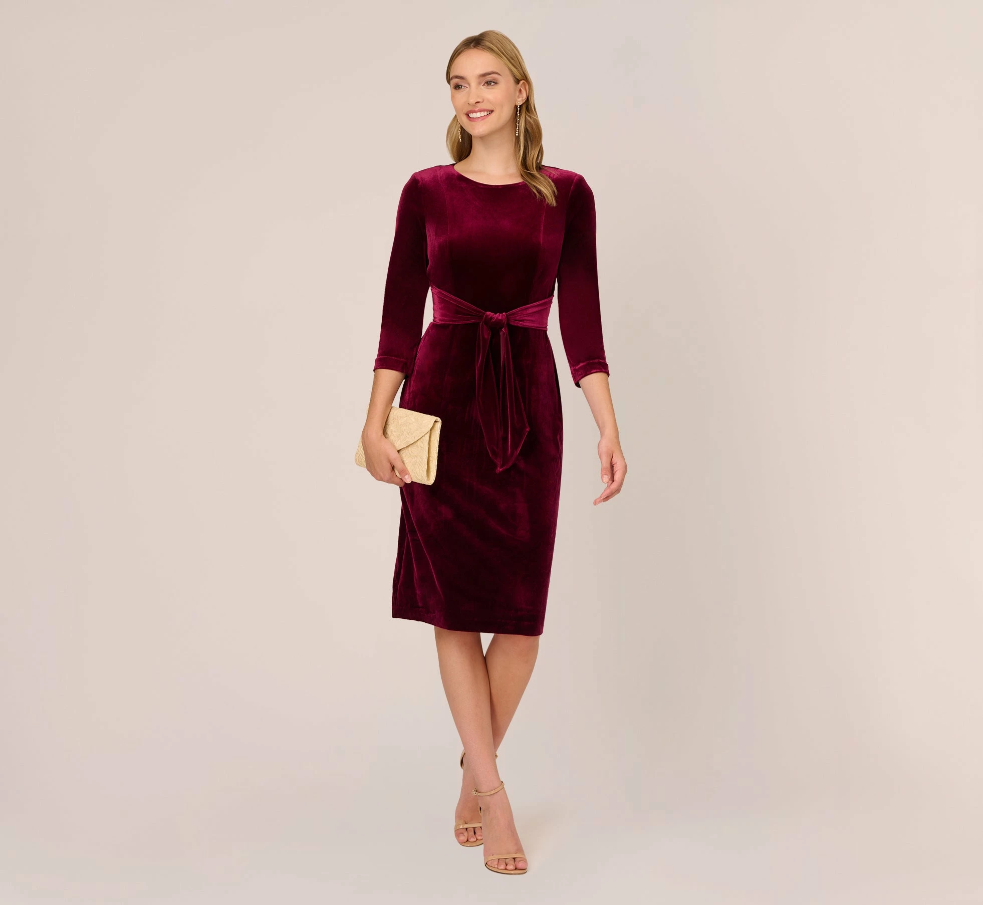 Adrianna Papell Velvet Tie Front Midi Dress With Three Quarter Sleeves In Burgundy