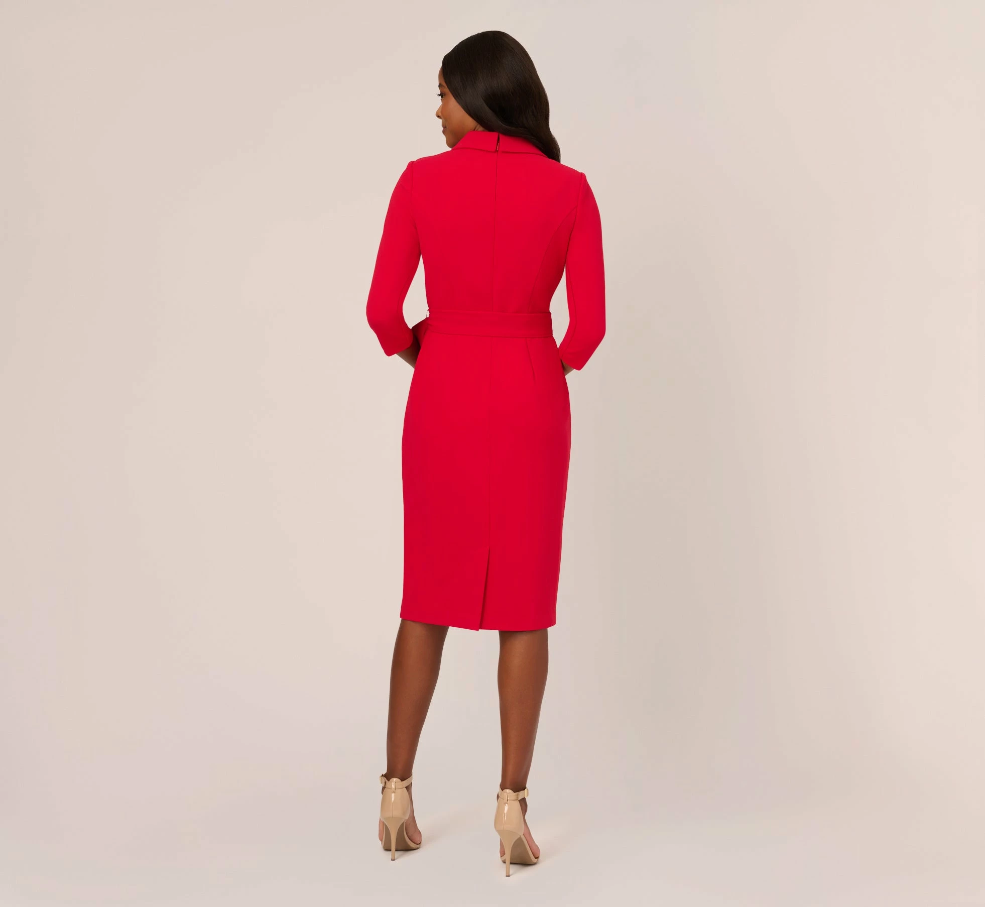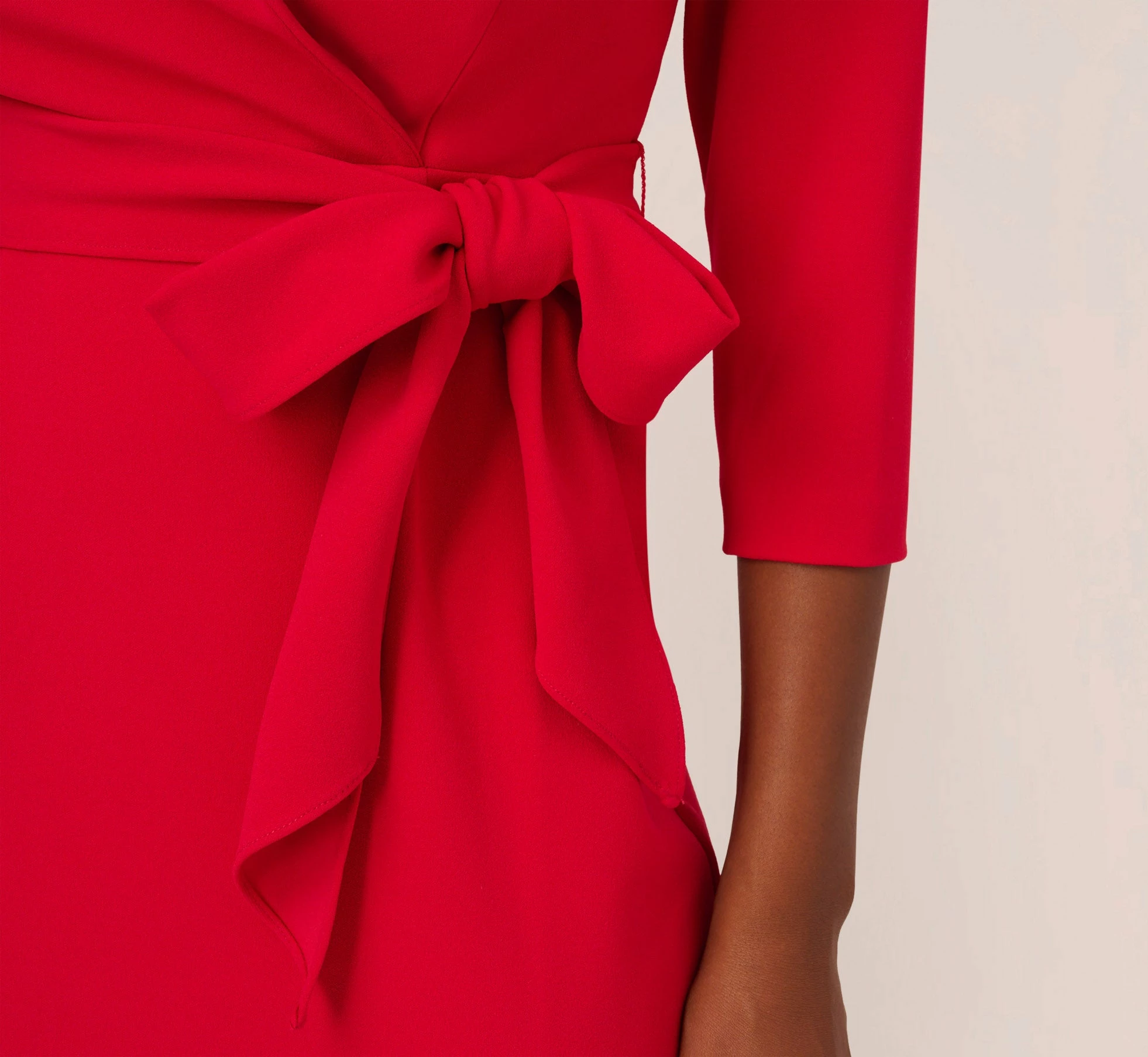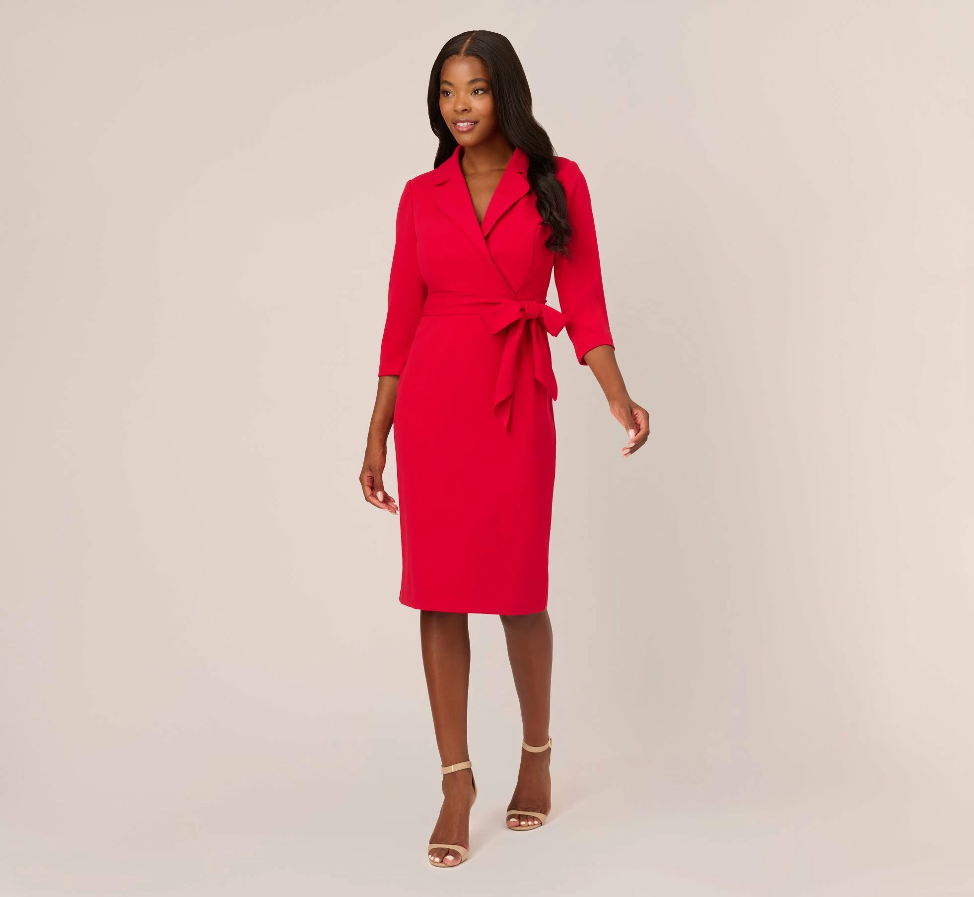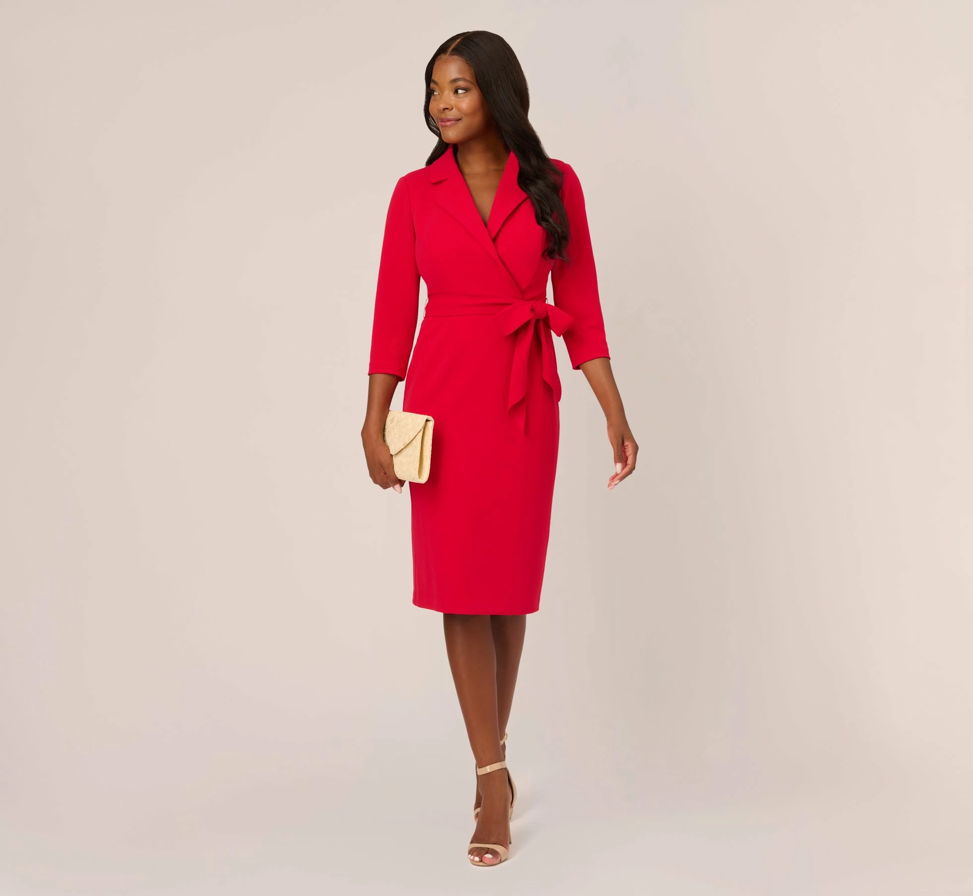No detail was overlooked in the making of this wrap dress. This sheath dress features a notched collar, three-quarter sleeves, and a self-tie waist. Crafted from crepe fabric, this wear-to-work dress is a tailored look. A zipper closure at the center back and a slit skirt complete this classicdress which is perfect for daywear through cocktail hour. Styled with nude heels and dressed up with a clutch, this wrap dress will be your go to from work to date night and beyond.