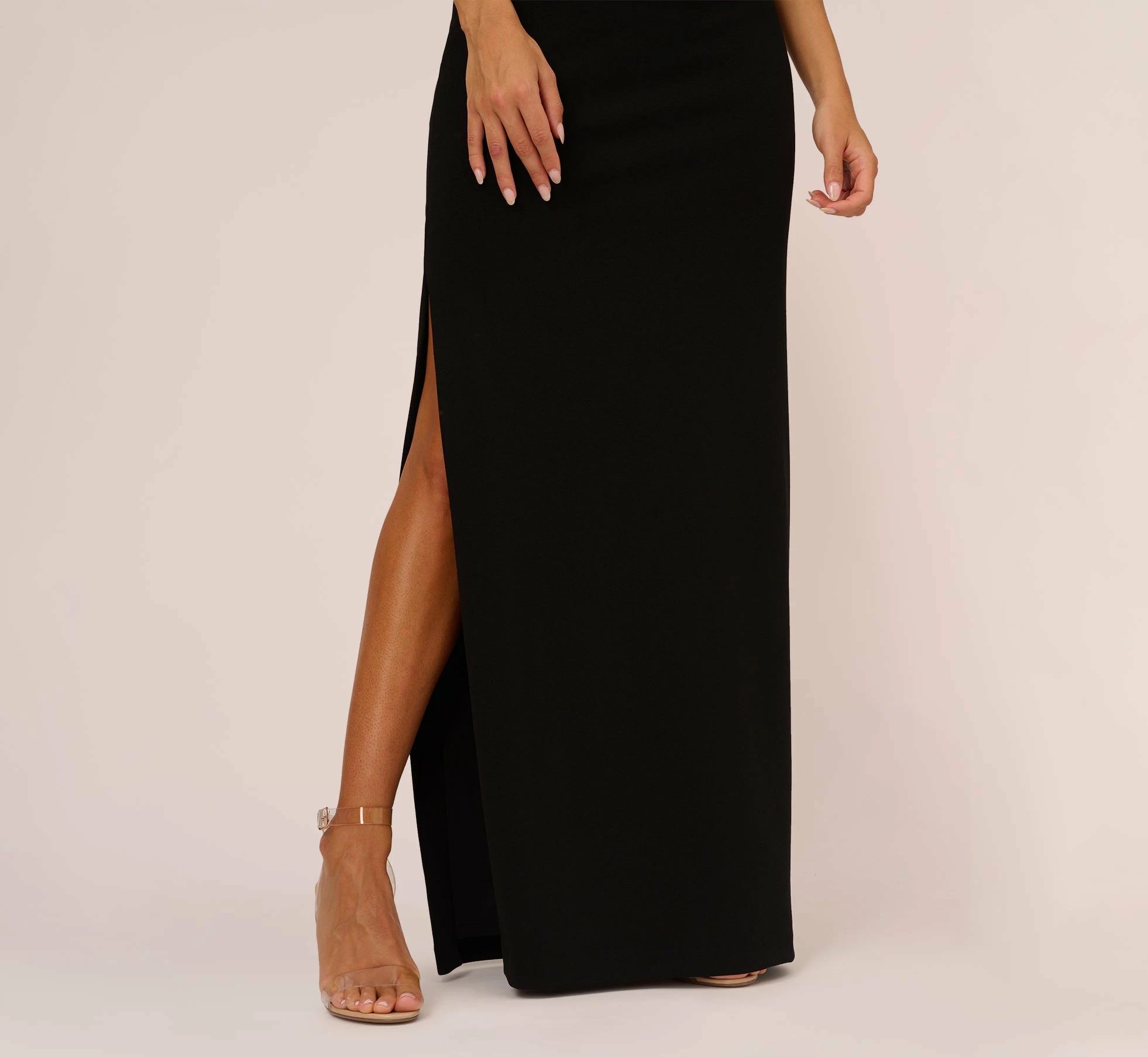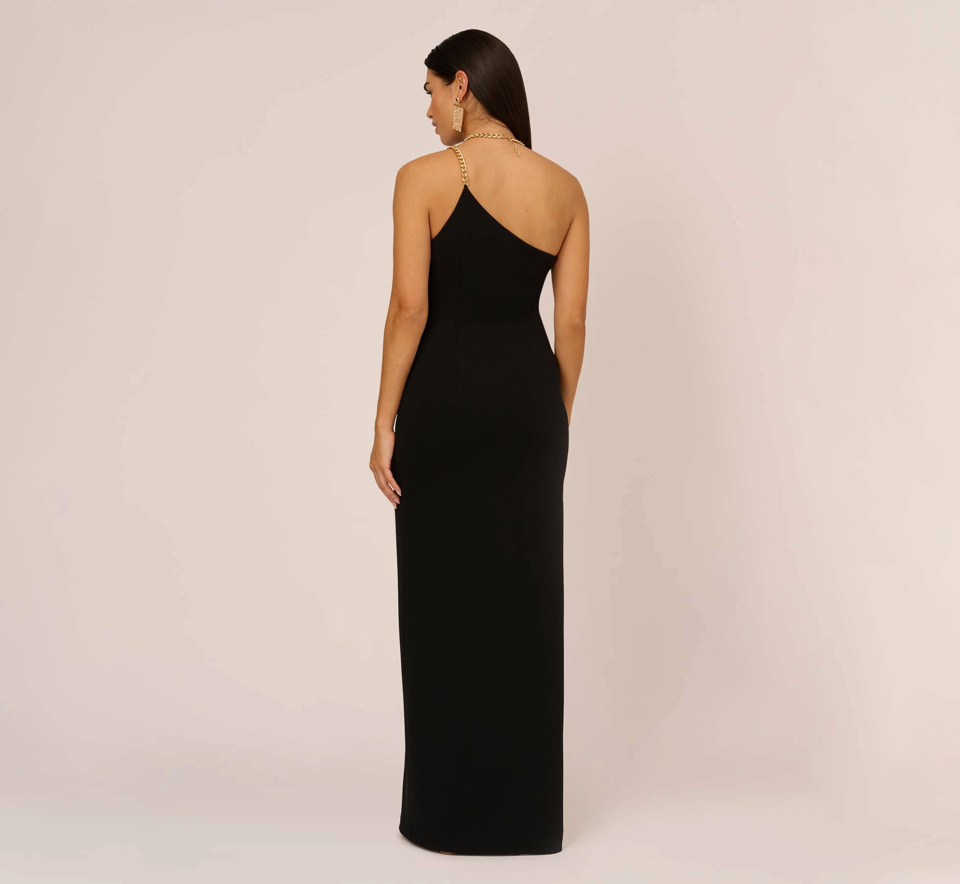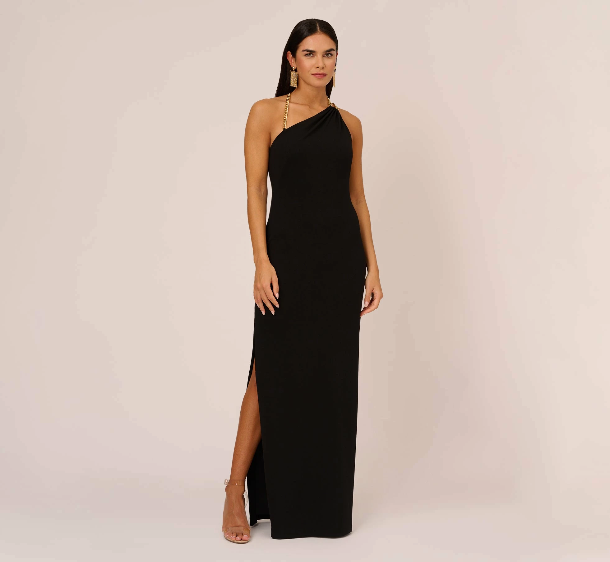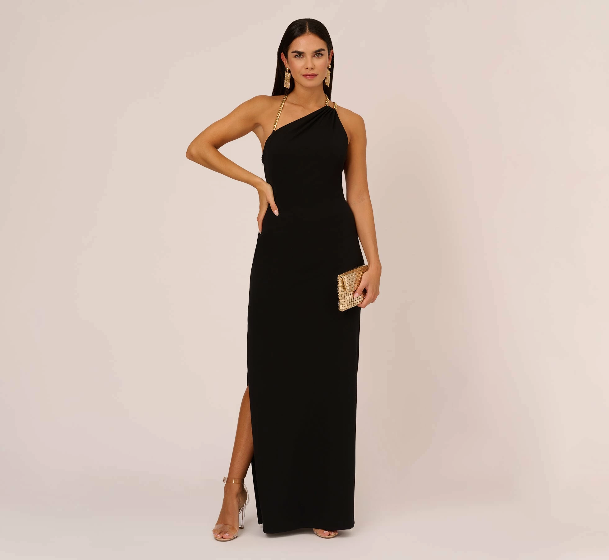 Skip the necklace and opt for this unique evening gown. This formal dress features a fitted bodice with asymmetrical neckline, metal chain straps, and a column skirt with slit at the side. The back of the gown boasts a one-shoulder illusion thanks to the unique chain strap design. Designed from knit crepe, this gown has some stretch. Pair this formal gown with a matching metallic heel and bold clutch to finish off this dramatic styling.