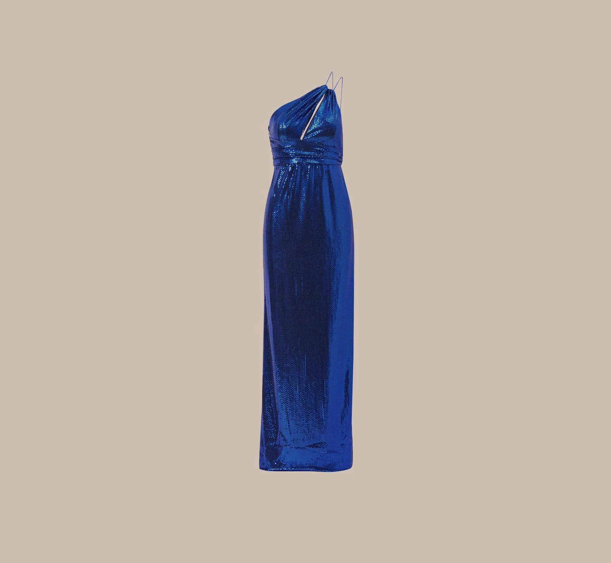 This one shoulder design hugs your curves in all the right places and features an alluring asymmetric bodice with pleated waistband. A striking cutout and thigh-high side slit turn up the volume on its dramatic appeal while the metallic knit fabric adds a glamorous touch. Side zipper with hook and eye closure. Be daring and bold in this showstopping number at prom, wedding celebrations and black-tie galas.