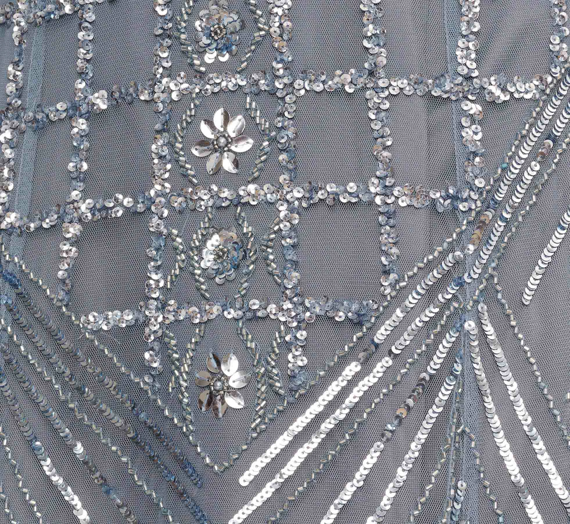 Step into the gala confidently in this incredible beaded ball gown. This formal dress features a circle neckline, fitted bodice, and a full skirt. A dramatic half-cape flows from the shoulders as a dramatic detail. Spectacular sequin beading in gorgeous lattice designs adorns the bodicepunctuated by beaded flower embellishments. Metallic heels are all this gown needs to finish it off.