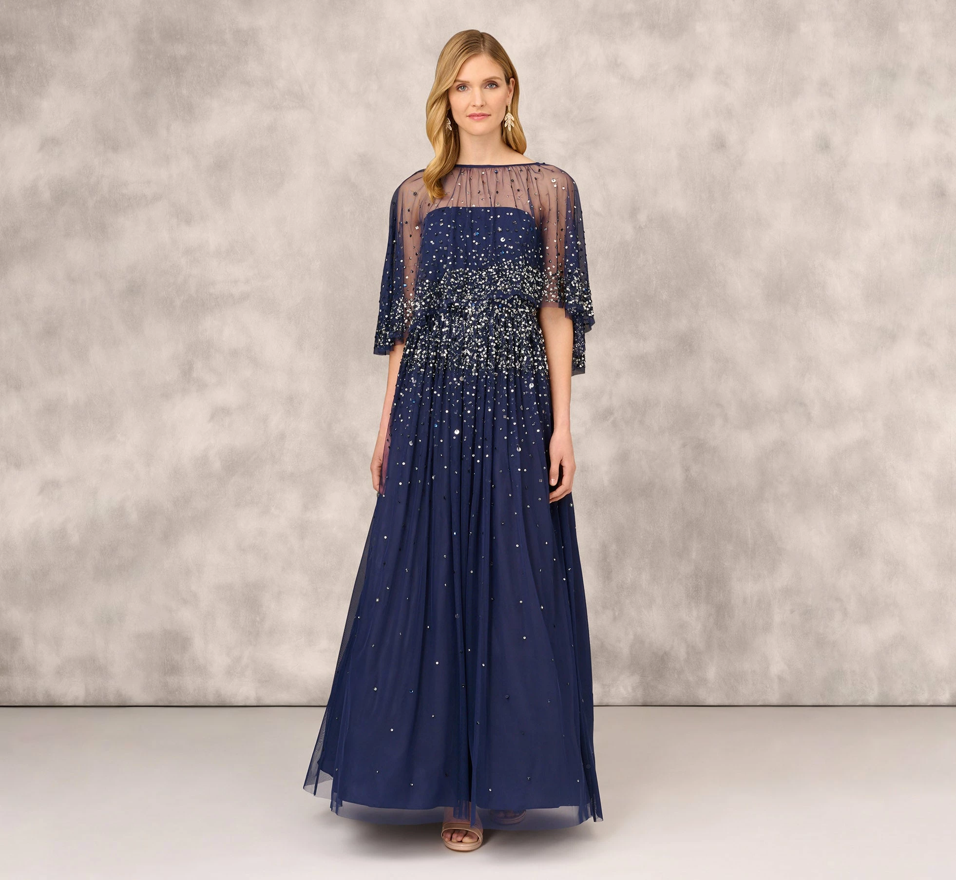 Who doesn’t love a gown with its own cape? This formal dress features a fitted bodice with a straight, strapless neckline and a full ball skirt. A removable sheer mesh cape creates a popover look with a high low silhouette, boat neckline, and a keyhole cutout with button closure. Both thecape and the gown are embellished with beaded details that gather at the waist and dissipate through the rest of the styles for a look that accentuates the figure. Style this strapless formal dress with a metallic heel and satin clutch for your next gala.