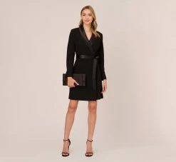 Adrianna Papell Long Sleeve Crepe Dress With Tuxedo Collar In Black