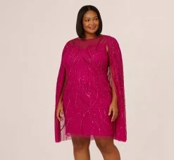 Adrianna Papell Plus Size Sequin Beaded Cape Dress With Illusion Neckline In Hot Orchid