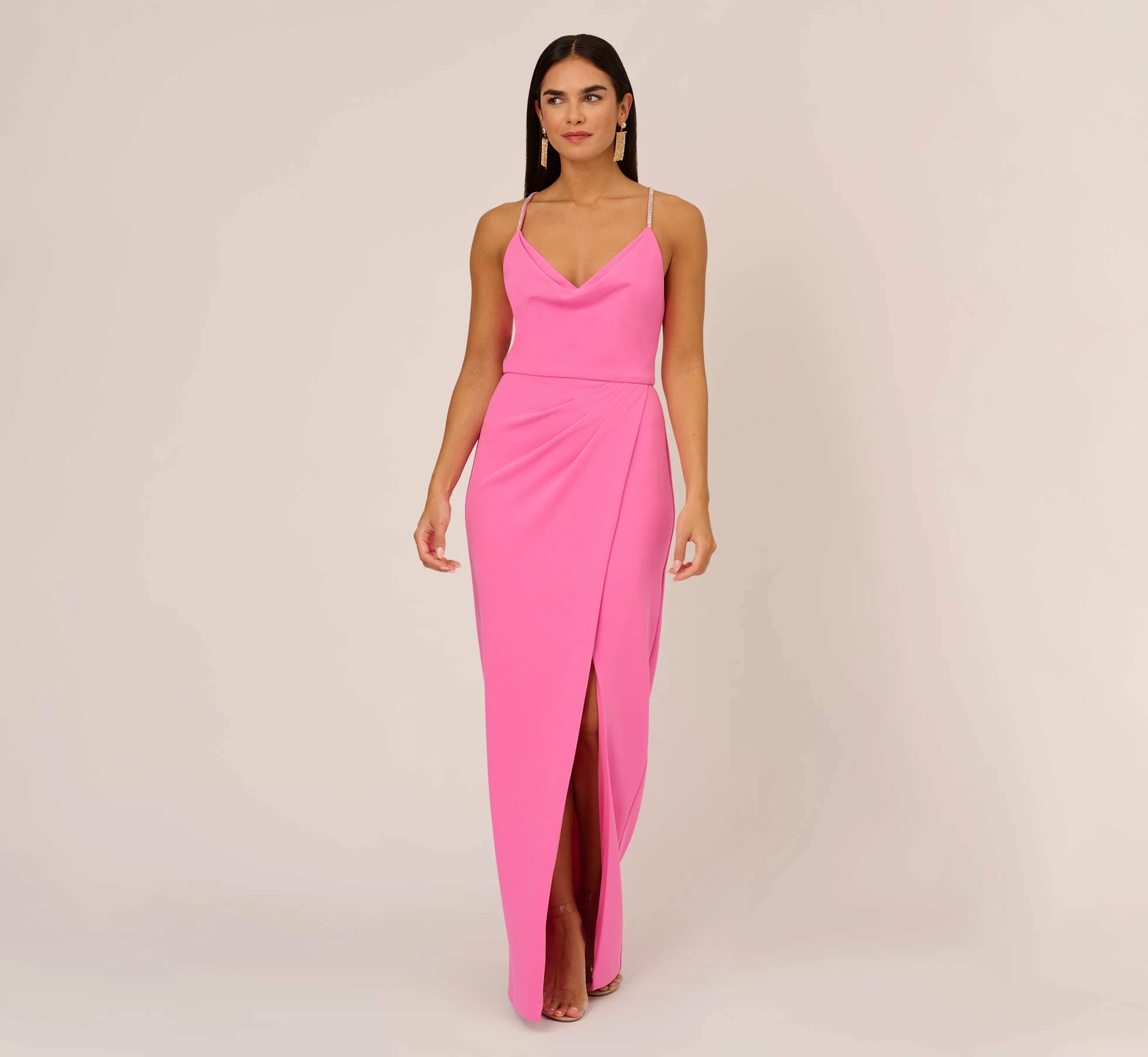 Simple but so so sweet, this column gown is a trend-forward look. This formal dress features a fitted bodice with cowl neckline, spaghetti straps that criss-cross across an open back, and a faux wrap skirt that drapes gently and reveals a slit at the front. Created from crepe fabric with slight stretch, this column gown is comfortable for all night wear. Styled with a simple heel and chandelier earrings, this crepe dress is a fabulous look.