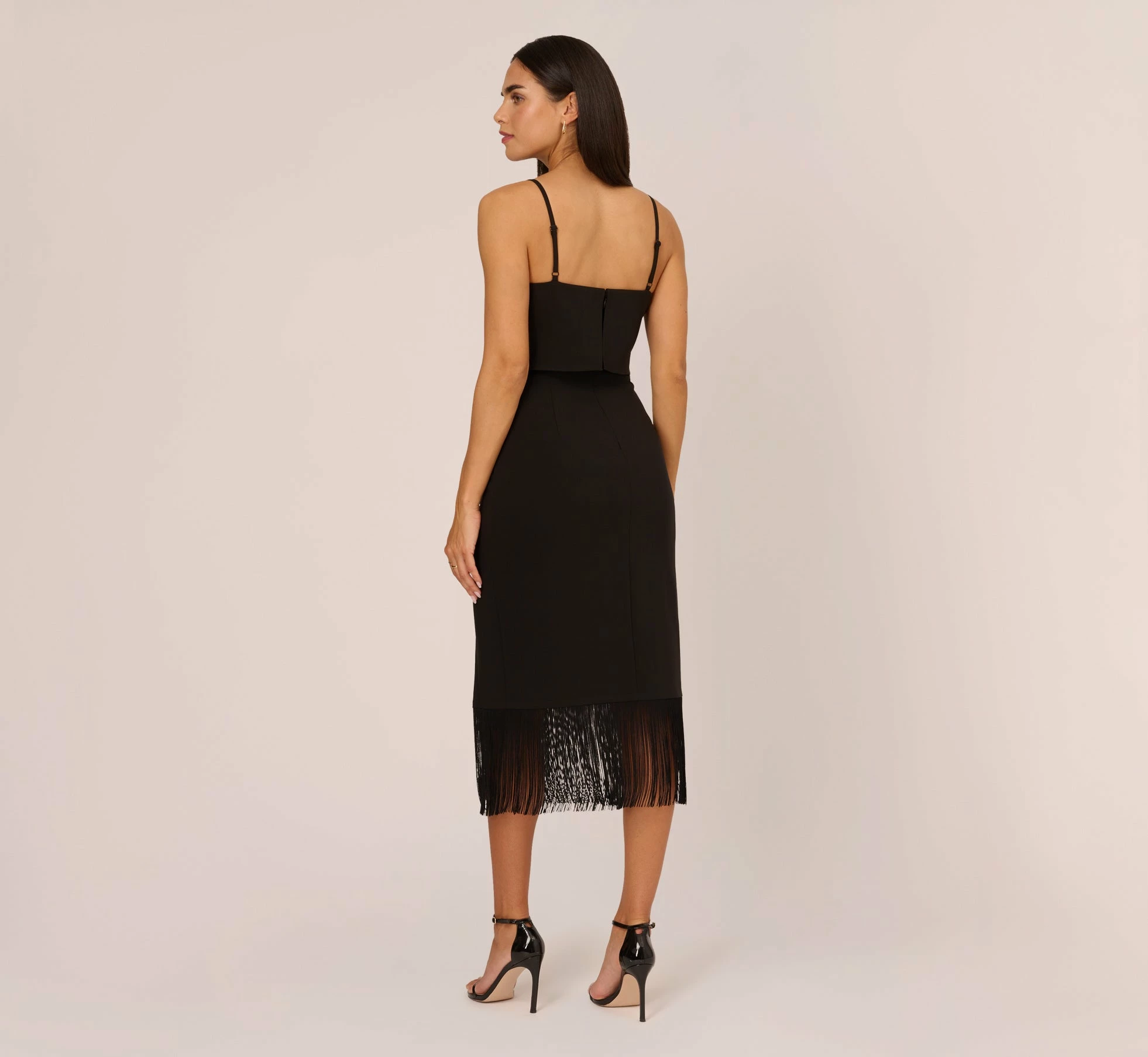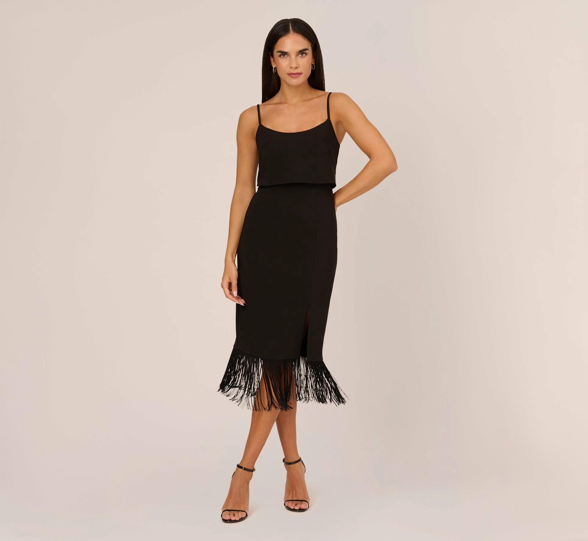 This simple sheath dress is anything but thanks to a mix of classic and trendy details. This cocktail dress features a scoop neckline, adjustable spaghetti straps, and a fitted skirt adorned with fringe. Crafted from crepe fabric, this dress has slight stretch. A popover design adds a unique touch to the bodice. A zipper closure completes this midi dress. Paired with a nude heel and statement earrings, this dress is ready for a night out.