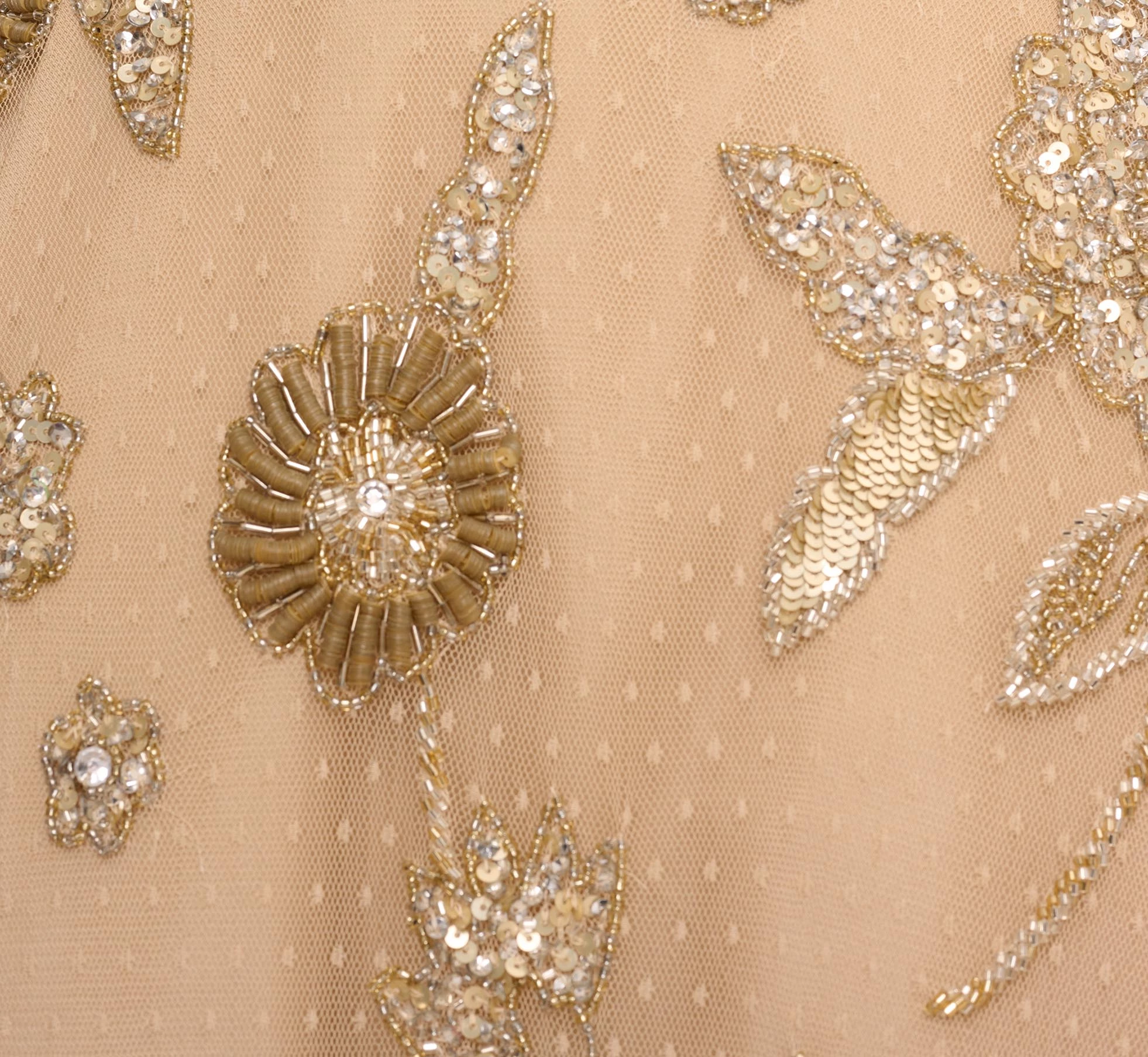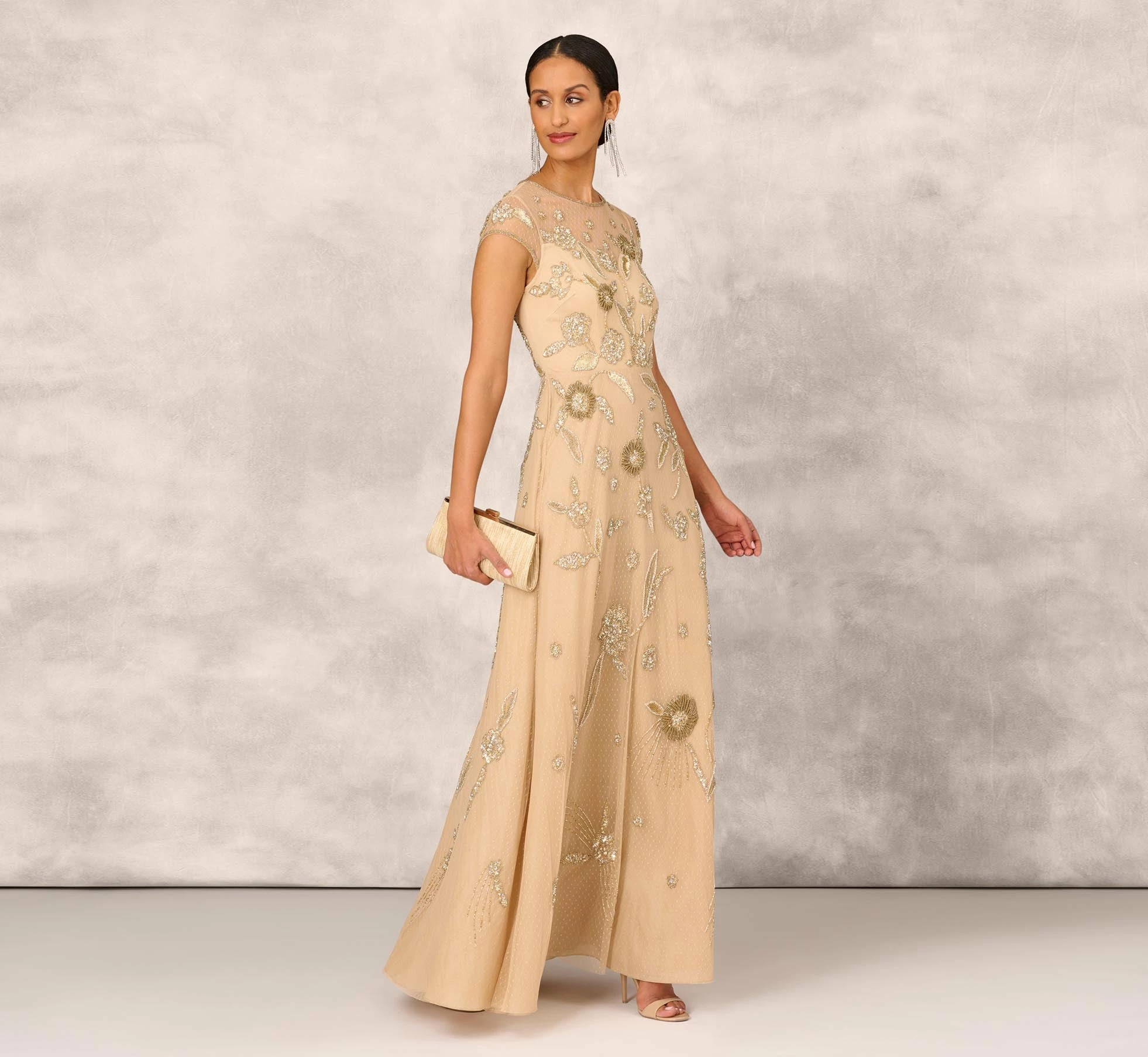 Defined by its romantic display of handsewn beadwork in a one-of-a-kind floral pattern embroidered on a finely woven point d’sprit mesh, this gown is cut in a fit-and-flare silhouette with a full sweeping ball gown skirt. Jewel neckline with beaded detail and sheer illusion yoke/short sleeves. Back zipper with hook-and-eye closure. Poly knit lining. Play up the glamour factor at wedding receptions, black-tie galas and charity events.