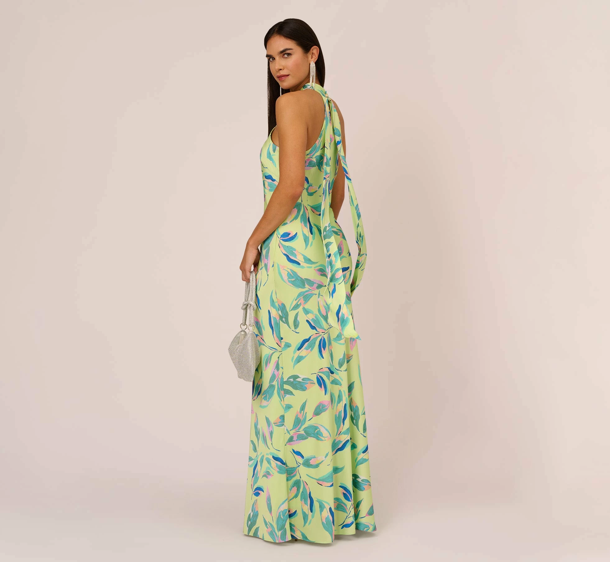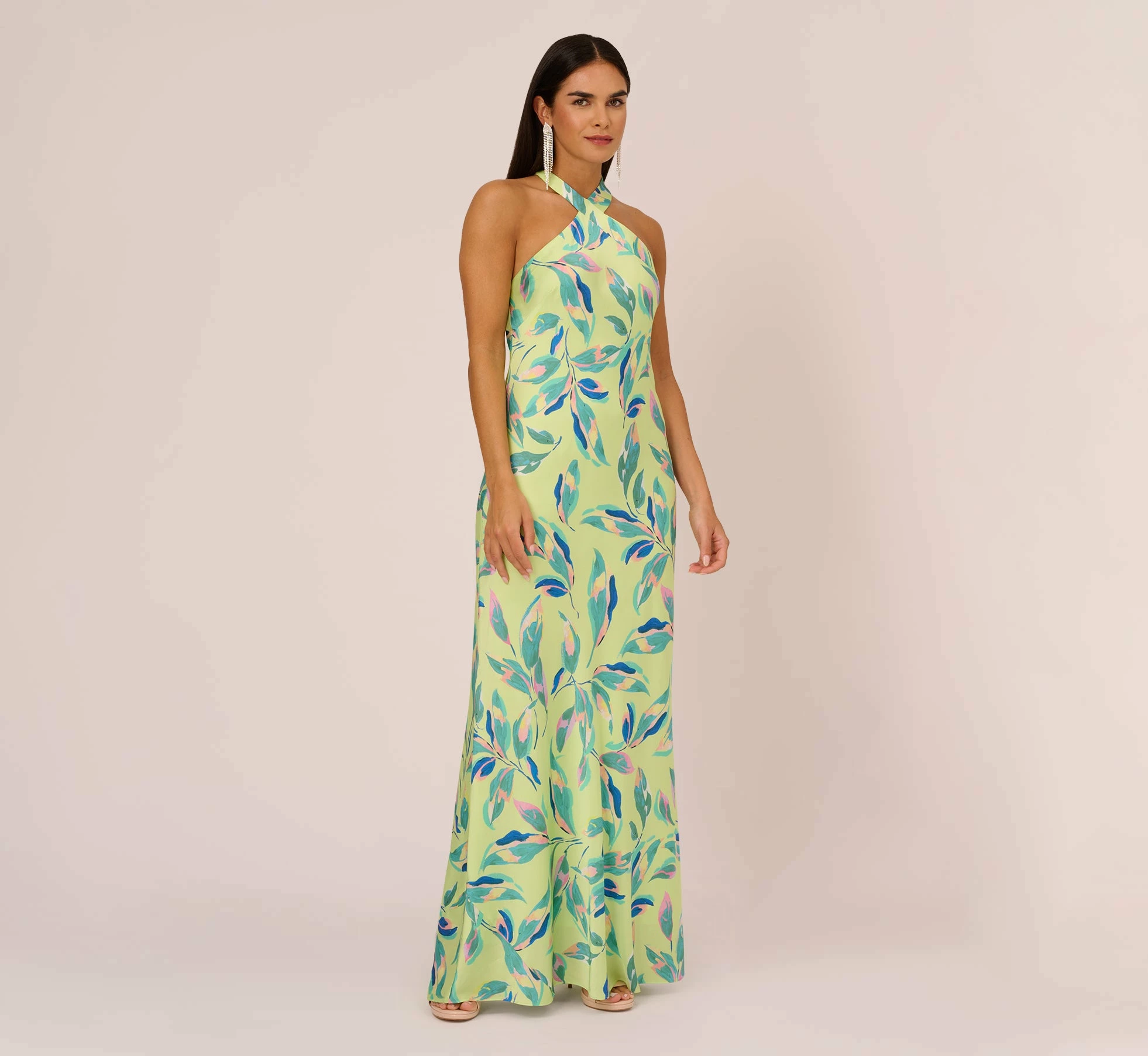 Show off this season with this show-stopping satin gown. This formal dress features a fitted bodice with halter neckline, mermaid skirt, and a keyhole back flanked by trailing cape details. Crafted from satin fabric covered in a multicolor foliage print, this dress has some stretch andwill add a bright touch anywhere it goes. Styled with neutral heels and a rattan statement jewelry, this dress will exude confidence.