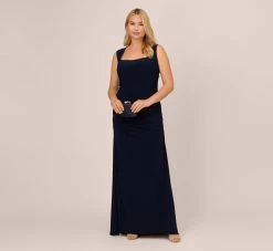 Adrianna Papell Plus Size Sleeveless Jersey Gown With Embellished Lace Cowl Back In Midnight