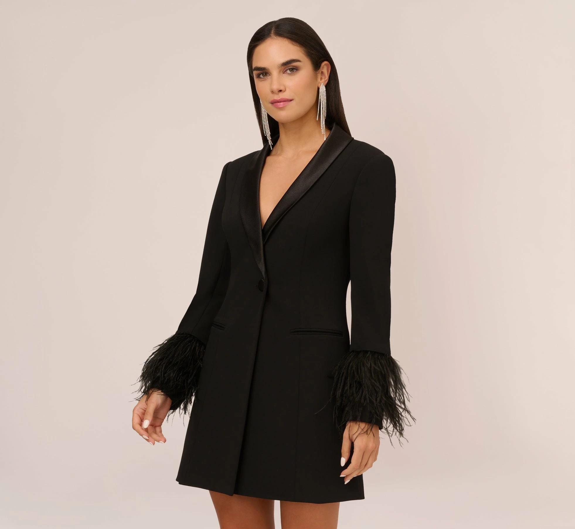 Knit Crepe Long Sleeve Blazer Dress With Feather Trim In Black