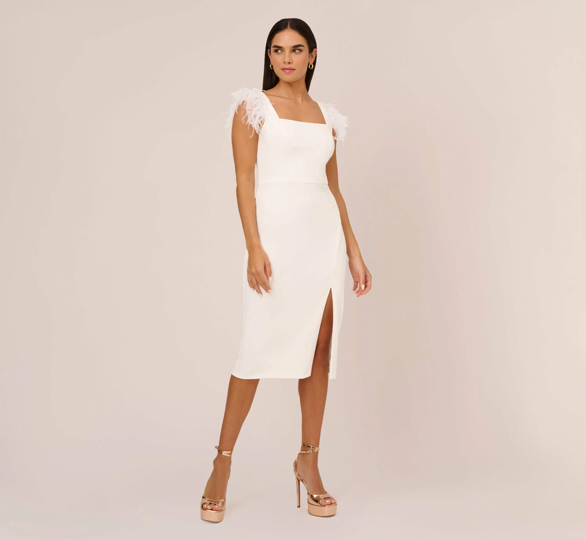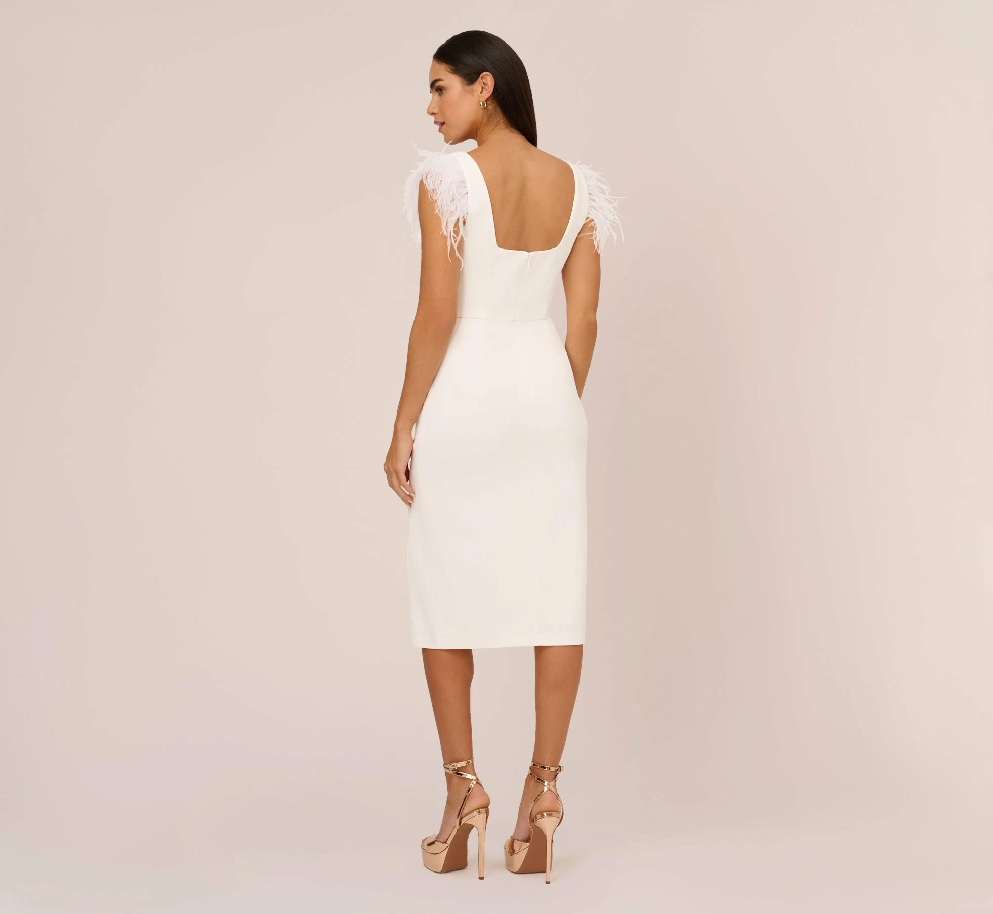 Flirty yet feminine, this midi dress was made for attention. This cocktail dress features a sheath silhouette, a square neckline and back, and luxurious feather accents at the armholes. Crafted from knit crepe fabric with a cozy stretch fit, this midi dress is a modern take on a timeless look. A zipper closure at the back completes the design. Styled with metallic high heels and a stone-clad clutch, this party dress is a pretty look for cocktail events and semi-formal parties.