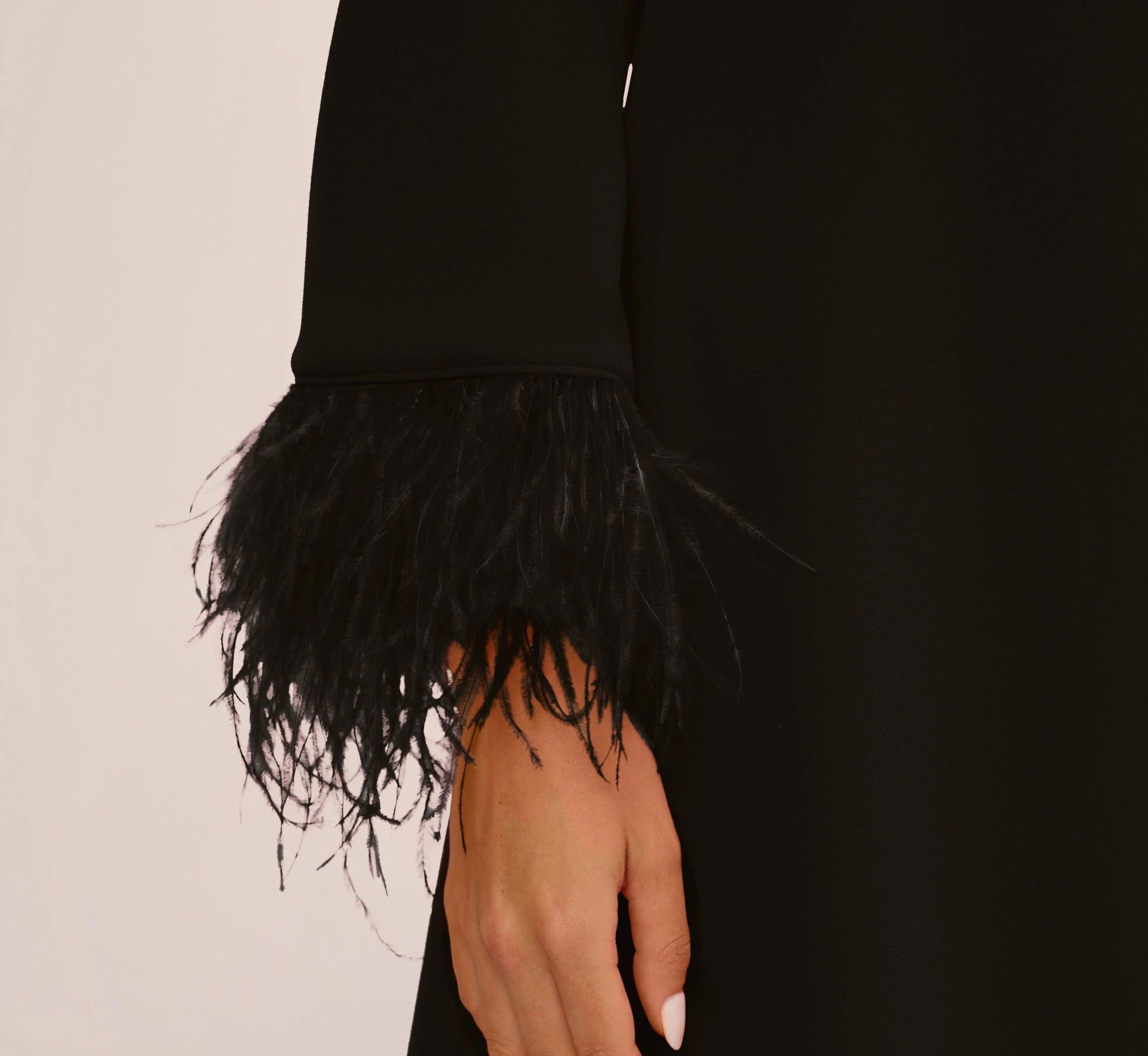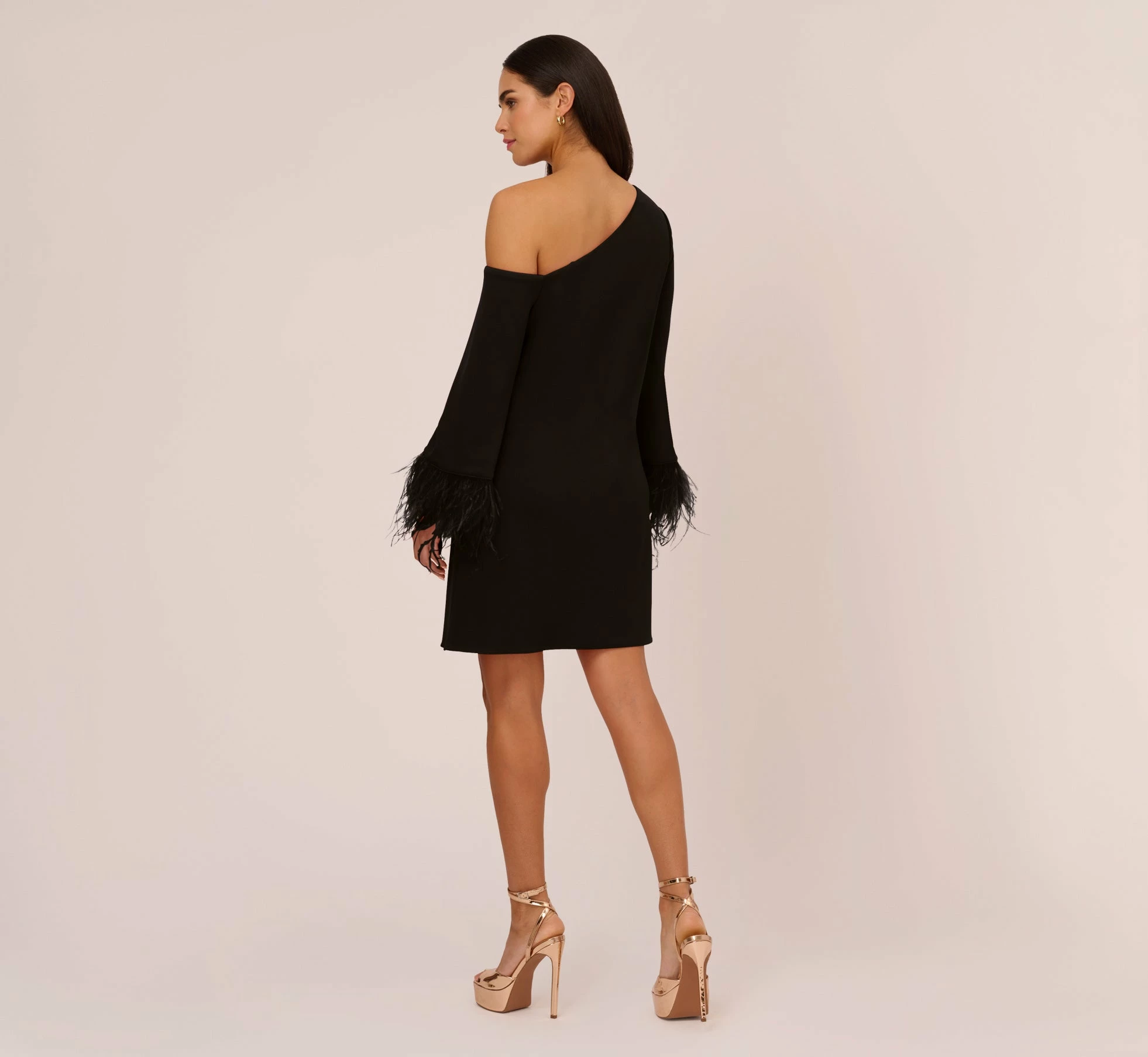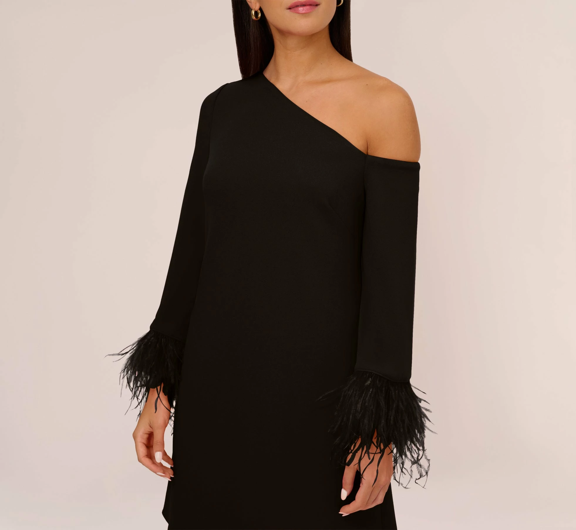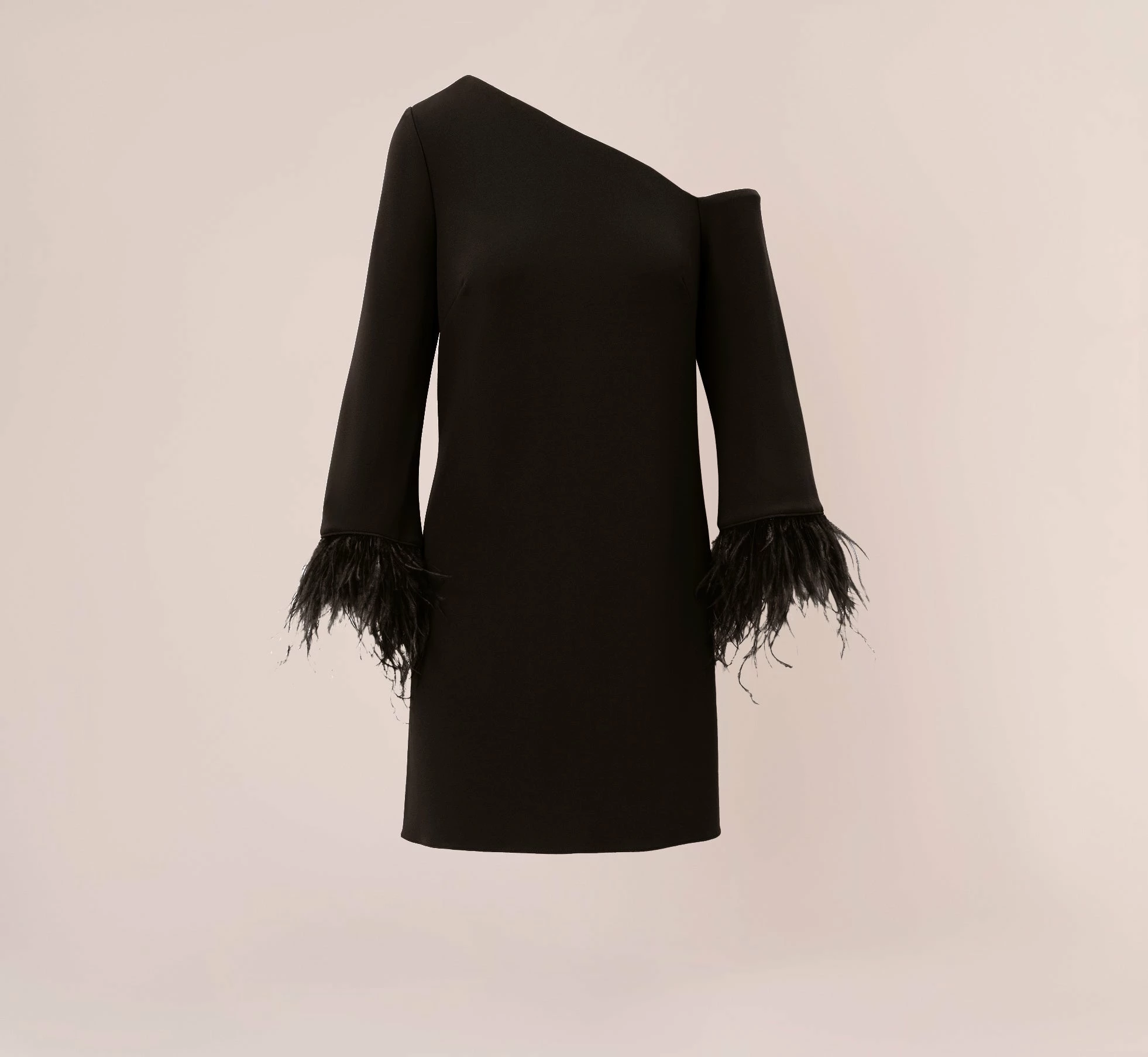 Trendy details shine on this asymmetrical dress. This trapeze dress features a one-shoulder neckline, long sleeves, and layers upon layers of lux feathers at the cuffs of the sleeves. Crafted from knit crepe fabric, this cocktail dress has stretch and gripper tape on the shoulder sleeve to keep it in place. A zipper closure at the back of this party dress completes the design. Add neutral accessories to this feather fringe dress for a polished look.