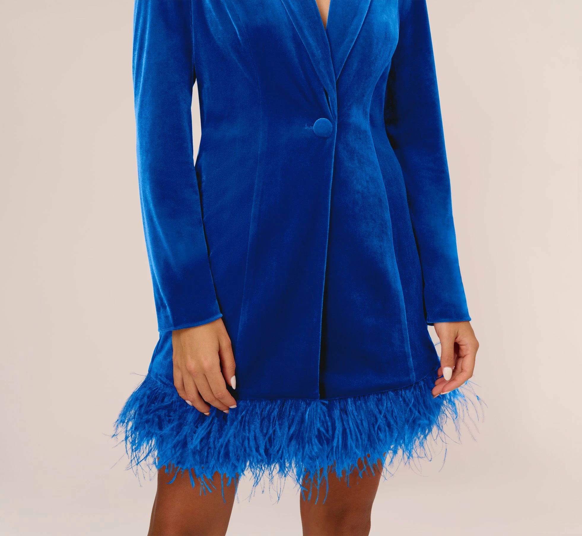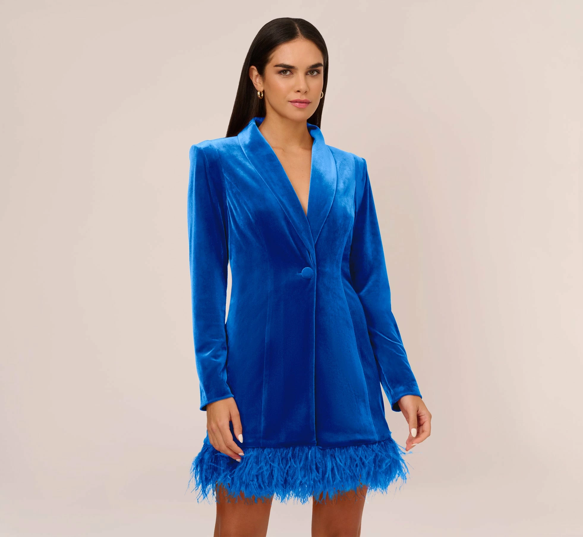 A modern take on the beloved Tuxedo Dress has arrived – and it’s a must-have. This cocktail dress features a tuxedo styling with lapels, a single self-button closure, long sleeves, and shoulder pads. Luxurious details like the velvet fabrication and the thick feather trim at the skirt hem add trend-forward notes to this Tuxedo Dress. Paired with a sparkling handbag and nude heels, this velvet dress scales from semi-formal to formal with ease.