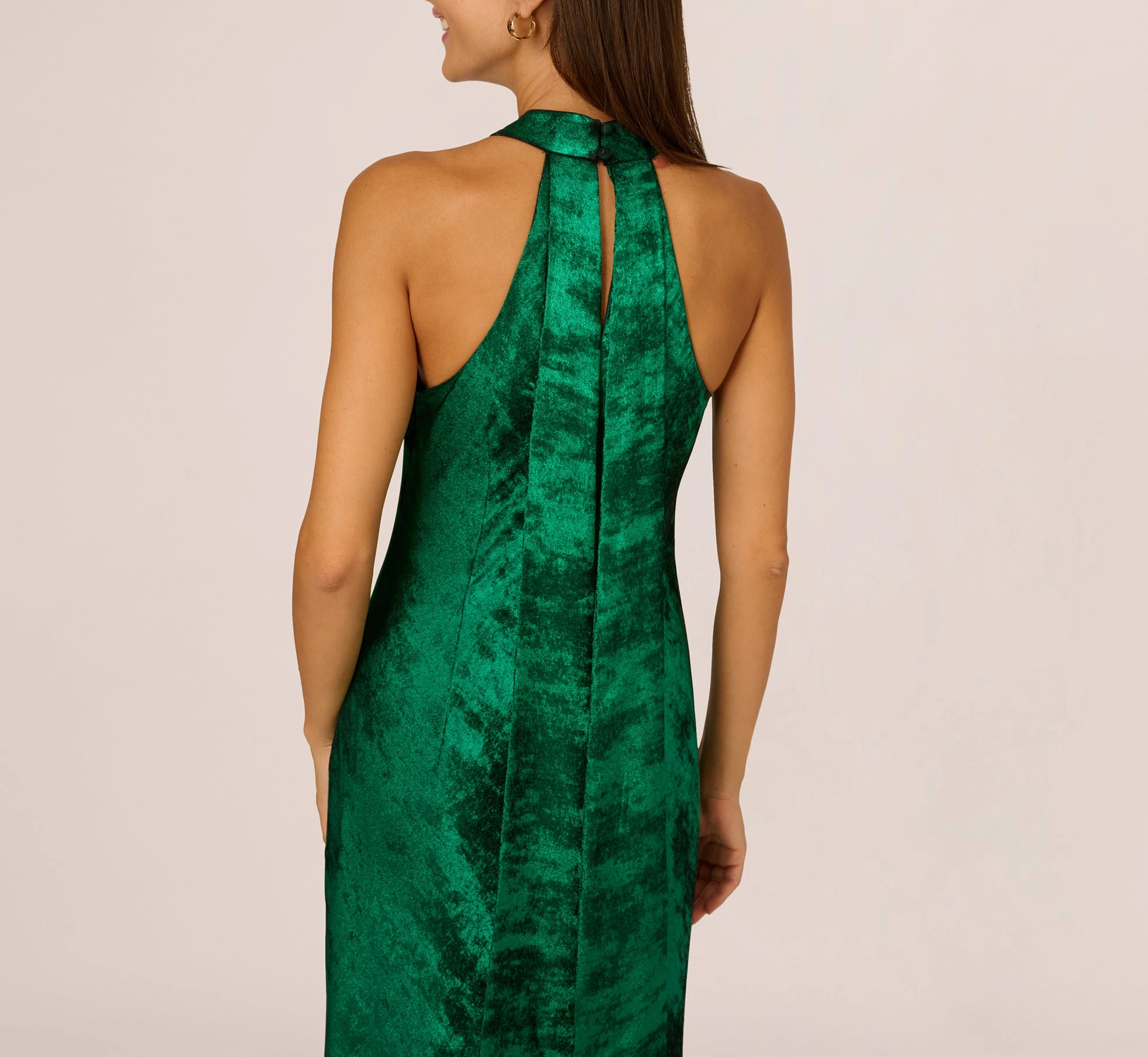 Be the star of the show in our glamorous halter dress fashioned from a sleek metallic foiled crepe de chine. This striking dress hugs your curves before ending at the mermaid hemline. Finished with a dramatic self-tie back and sleek back zipper with hook-and-eye closure. Make a stunning statement at your next formal affair.