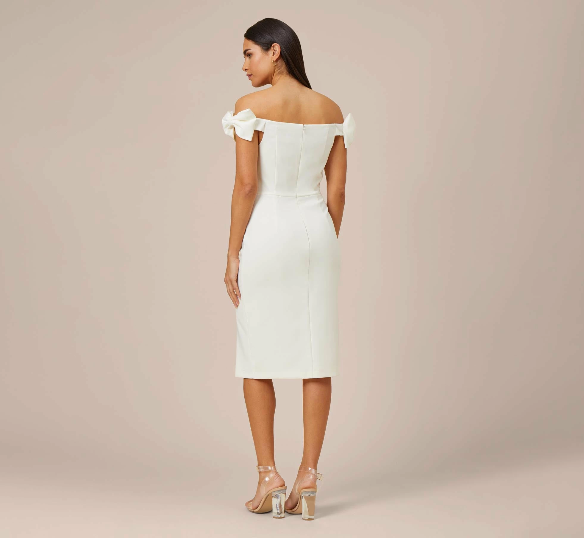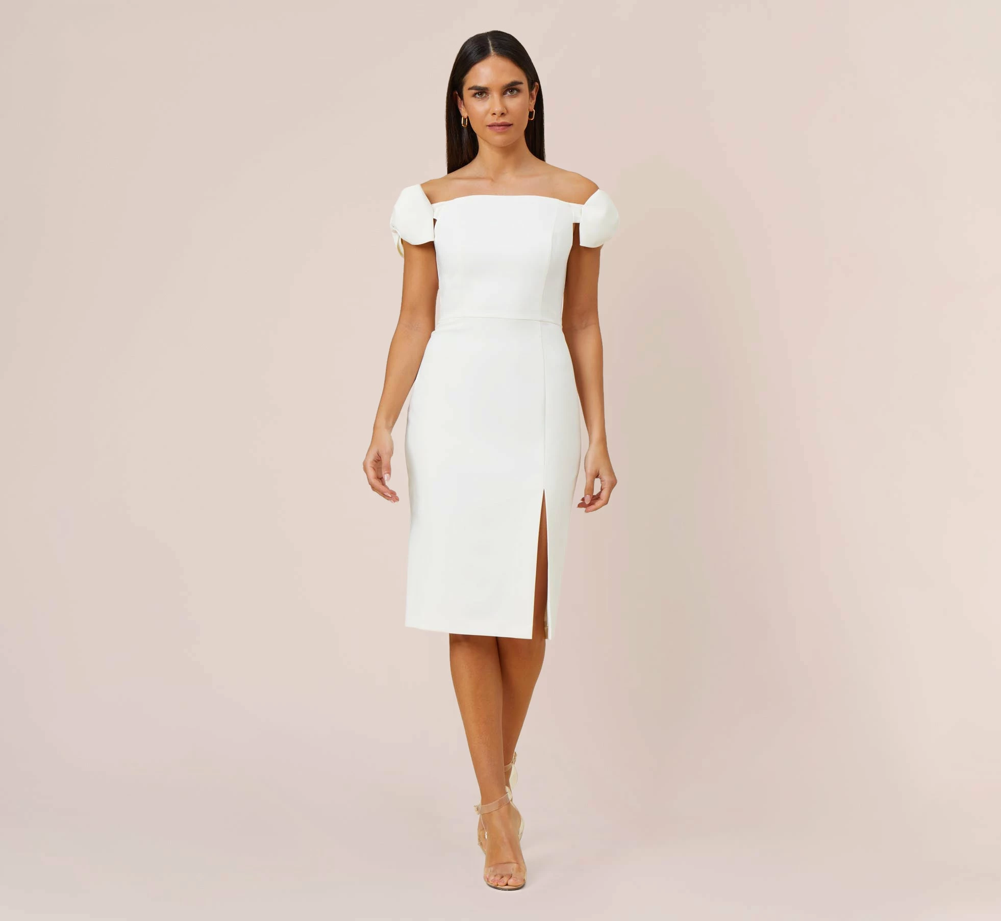 Meet our incredible soft stretch woven crepe sheath dress that fits like a dream with all the detail you want: a sexy, off the shoulder silhouette with feminine bows and a striking front slit that gives you the freedom to dance ‘til dawn. Back zipper with hook and eye closure. Cocktail chic that’s also extremely comfortable. Yes, please.
