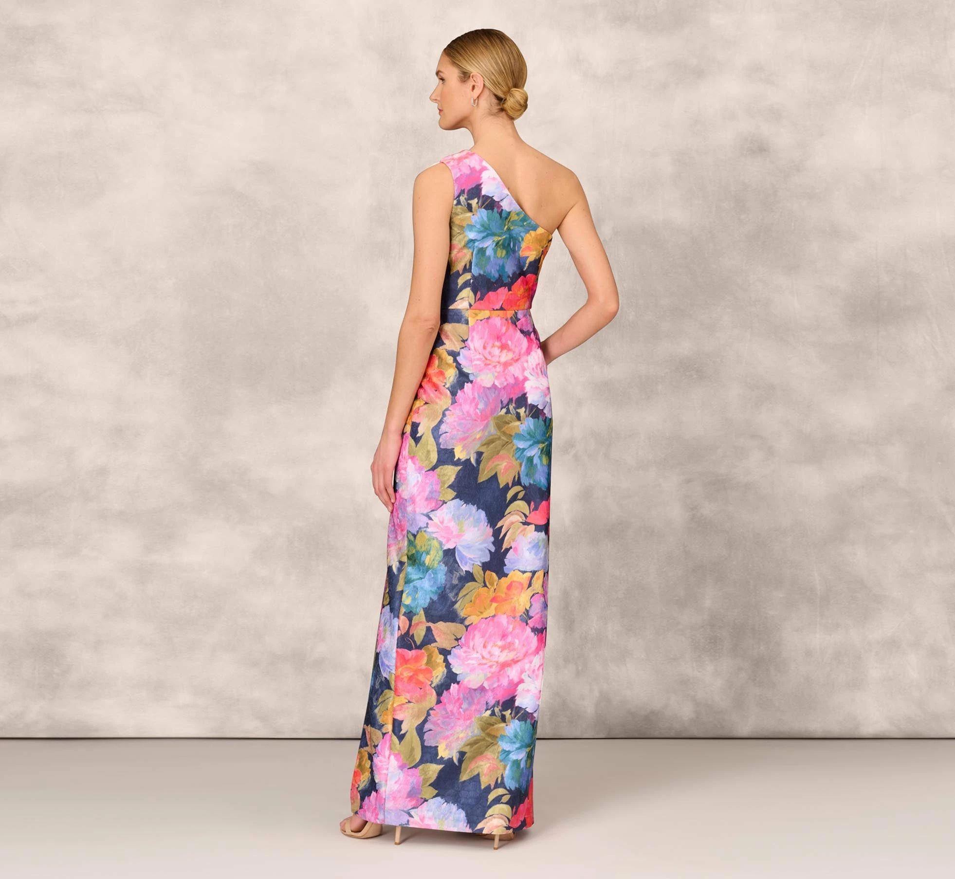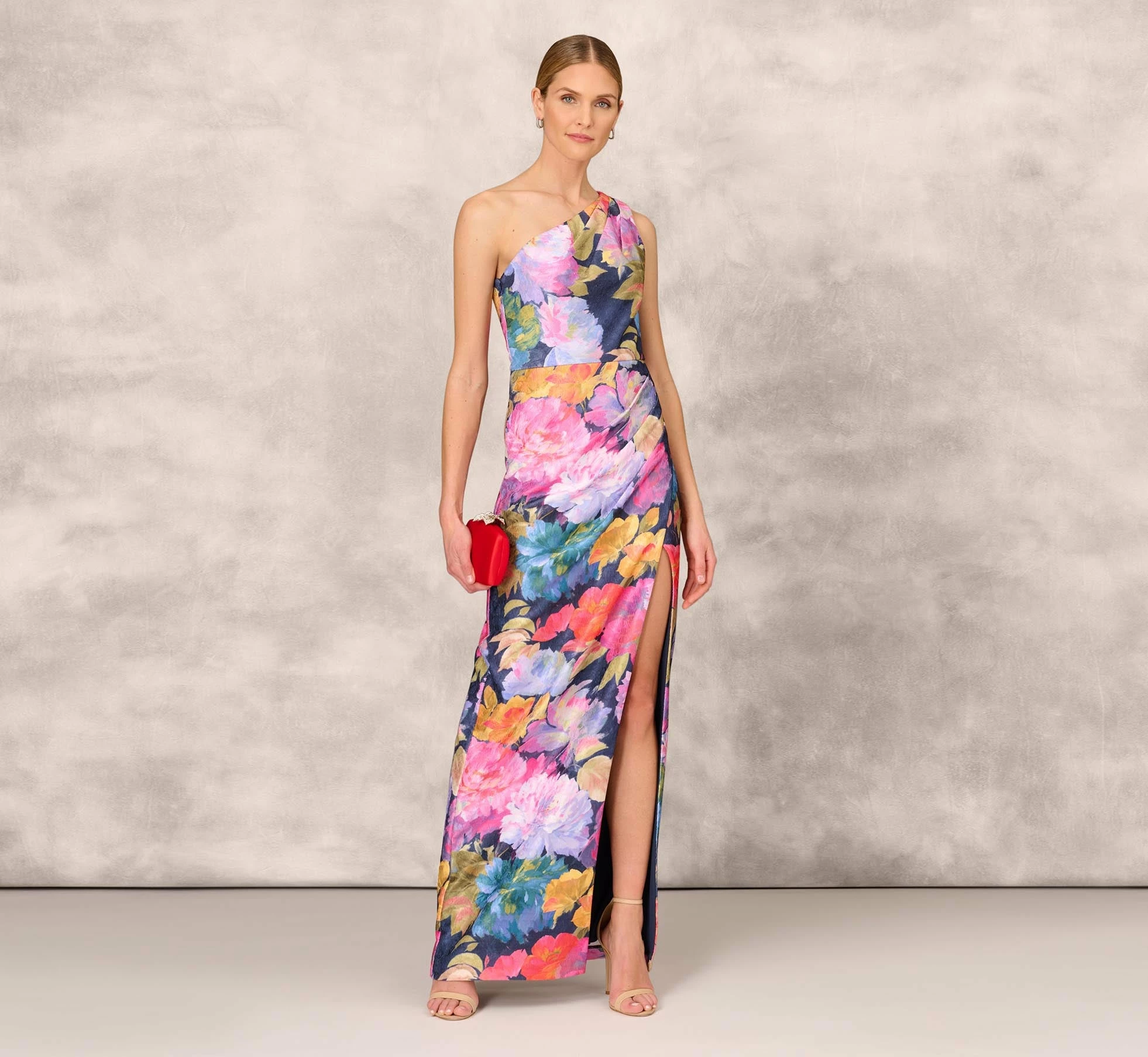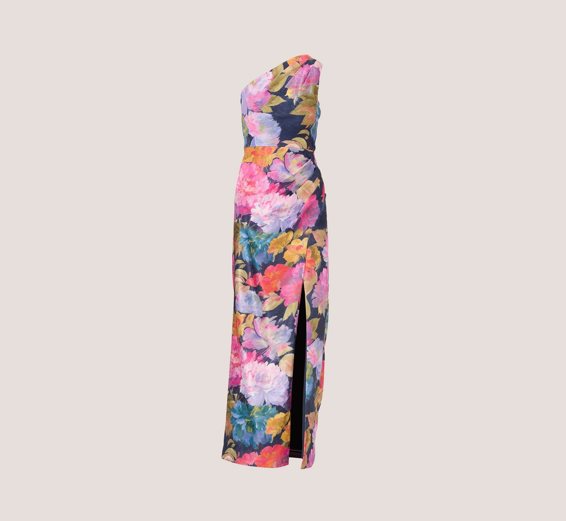 Brilliantly printed with a timeless silhouette, this evening gown is a memorable style. This floral gown features a fitted bodice, column skirt, and a thigh high slit at the side. Deliciously draped details accentuate the wearers figure. A bright floral print in multicolor adorns the fabric for a bold pop. A zipper side closure completes this design. Paired with a bright clutch and heels, this formal dress is a romantic look.