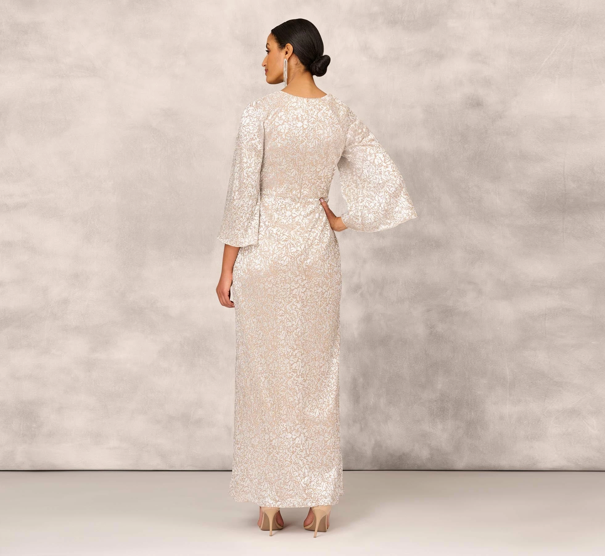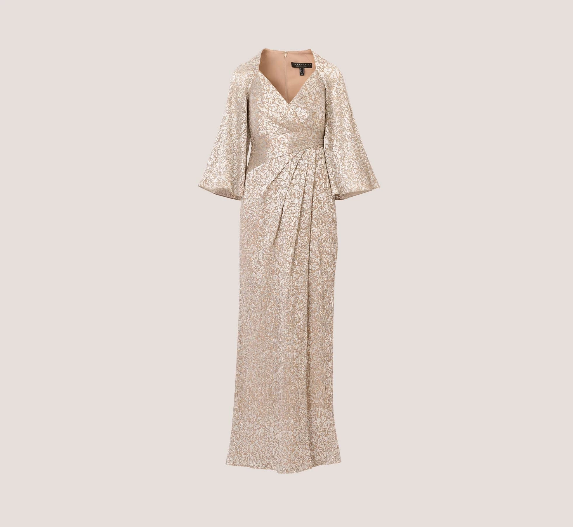 This striking column dress is made from a pleated lurex mesh with a foiled organic print for a shimmering finish. Cut for a slim fit, it features a flattering surplice neckline and asymmetrical waist band that tops the floor-grazing wrap skirt with pleated detailing and thigh-high slit. Elbow-length flutter sleeves. Back zipper with hook and eye closure for a smooth finish. Poly knit lining.