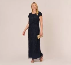 Adrianna Papell Plus Size Hand-Beaded Blouson Long Gown With Flutter Sleeves In French Blue