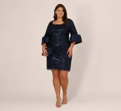 Adrianna Papell Plus Size Sequin Embroidered Dress With Taffeta Bell Sleeves In Midnight