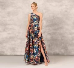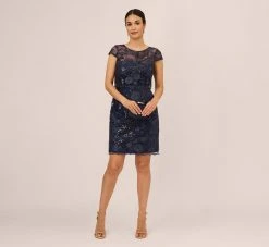 Adrianna Papell Short Sleeve Floral Embroidered Gown With Ribbon Tie Waist In Midnight Multi Nude