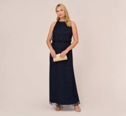 Adrianna Papell Plus Size Art Deco Beaded Blouson Dress With Halter Neckline In Navy Black