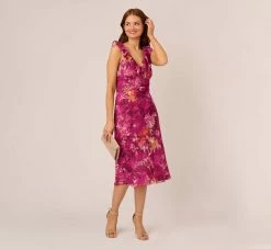 Adrianna Papell Metallic Floral Chiffon Midi Dress With Ruffled Neckline In Raspberry Multi