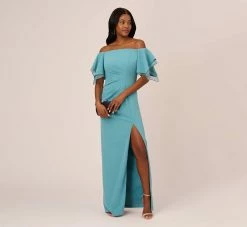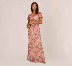 Adrianna Papell Floral-Print Metallic Twist Front Long Gown With Flutter Sleeves In Alabaster Multi