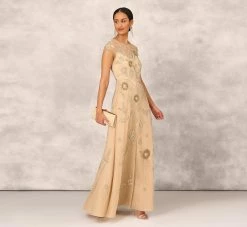 Floral Hand-Beaded Point D Sprit Mesh Illusion Gown In Light Gold