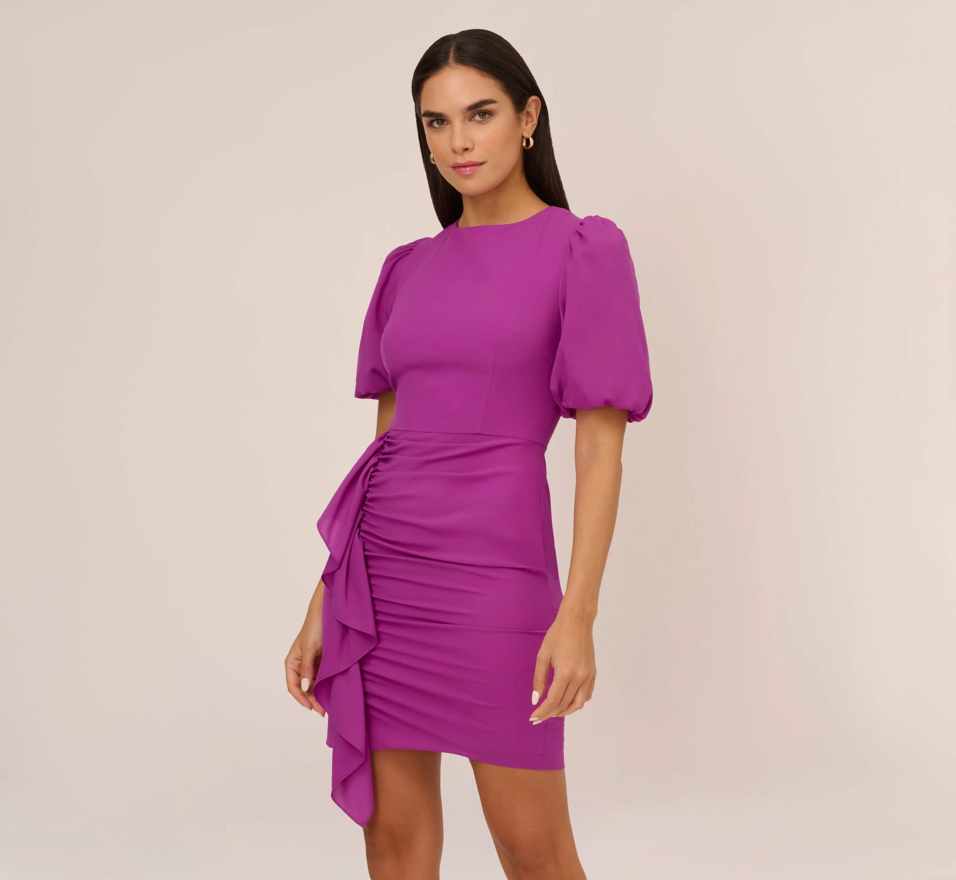 Little details have a big impact on this short sleeve cocktail dress. This sheath dress features a fitted bodice with a crew neckline, puff short sleeves, and a gathered skirt that skims the figure. A cascading ruffle at the waist adorns the side of this cocktail dress. Crafted from stretch CDC fabrication, this party dress is a lovely look. A zipper closure at the center back completes this design. Metallic high heels or a neutral pump and a stone-adorned clutch are the prettiest additions to this semi-formal dress.