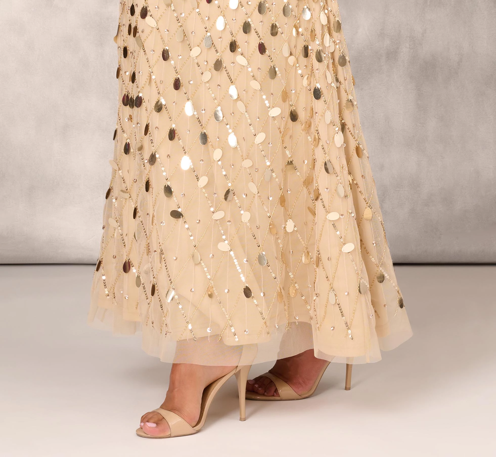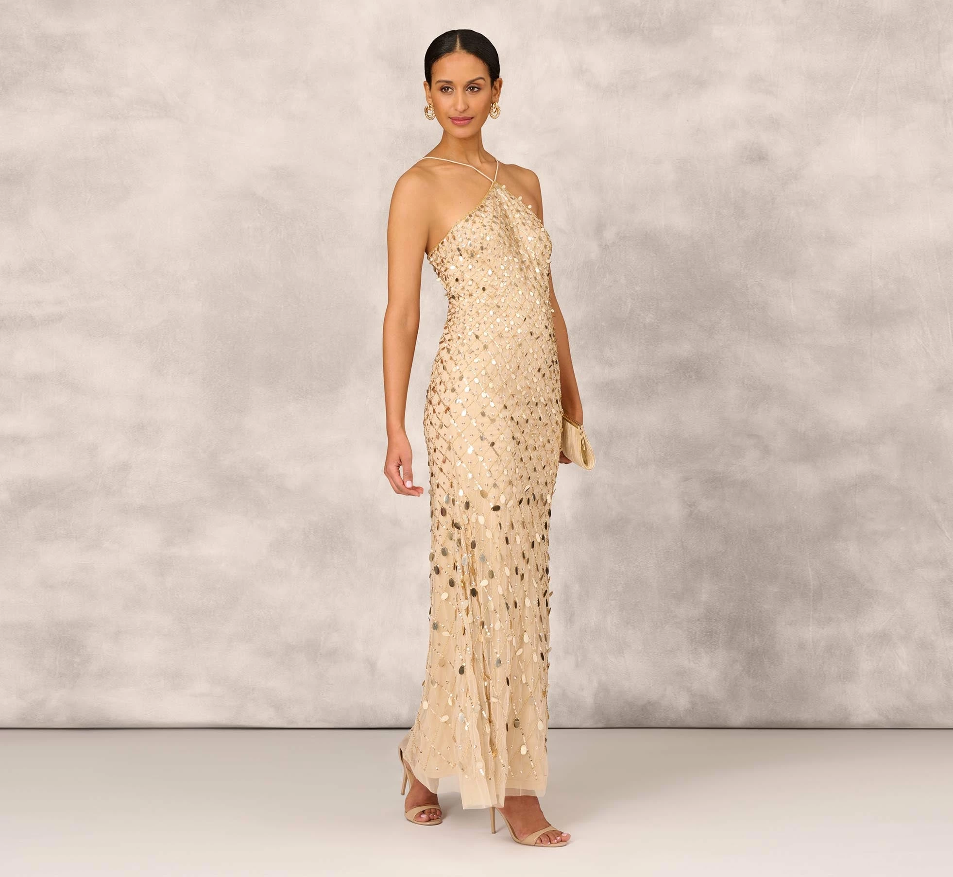 Dripping in beautiful details, this sequin mermaid gown is an exquisite look. This formal dress features a spaghetti strap halter neckline, fitted bodice, and a flared mermaid skirt. Adorned with brilliant beading and sequins that get bigger and bolder as you move down the gown creatingstunning contrast, this Aidan Mattox look is a must-have. Paired with statement earrings and neutral heels, this halter gown stands out from the crowd.