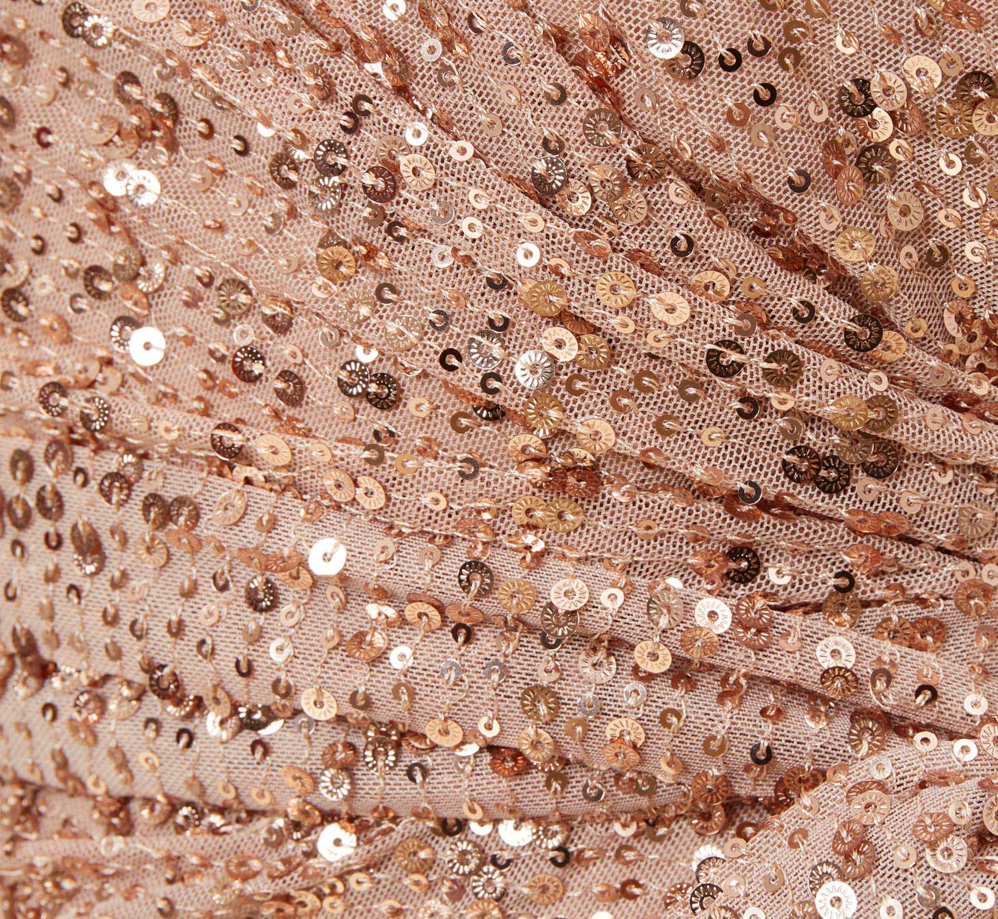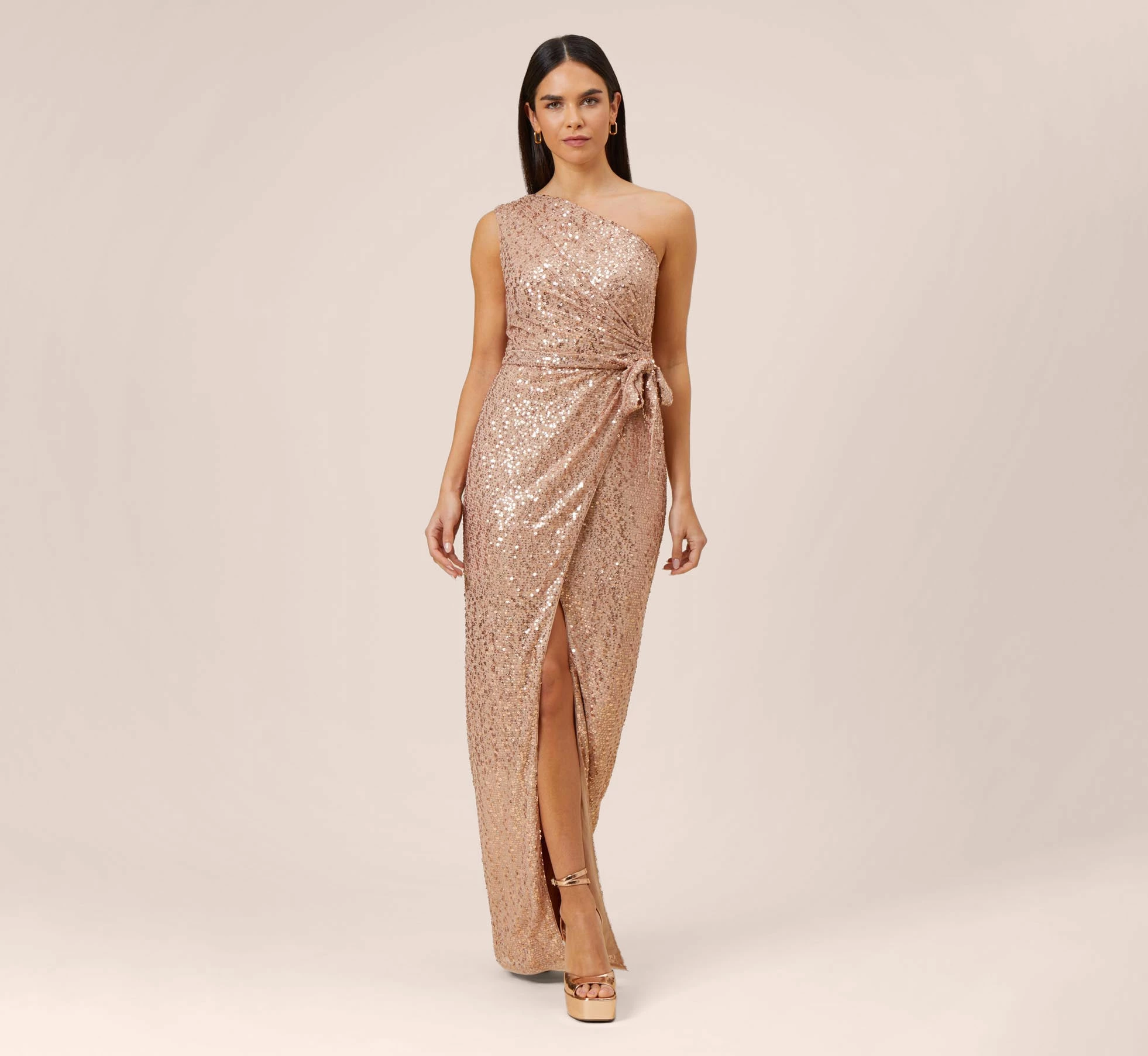 Crafted from an intricate display of head-to-toe sequins on stretch mesh, this one shoulder dress is gathered with a side sash to create a flattering silhouette. Exquisitely tailored, yet so comfortable, it features a sultry leg slit for an alluring finish. Side zipper with hook and eye closure. Give them your best glamorous attitude with this showstopping dress at prom, wedding celebrations and black-tie galas. Poly knit lining.