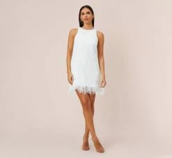 Fun, shimmering and oh so festive, our party-ready dress is adorned with allover sparkling sequins and ethically sourced ostrich feather trim. Designed to gently skim your body and then eases to a flared hem. Features a shoulder-baring halter neckline and a flirty back keyhole opening. Sleek back zipper with hook and eye closure for a smooth fit. Poly stretch lining. An easy add-to-cart for bridal showers, rehearsal dinners, bachelorette parties and even low-key brides-to-be.