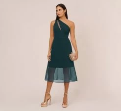 Knit Crepe One Shoulder Dress With Sheer Cutout And Skirt In Forest
