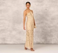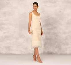 Sequined And Embroidered Midi-Length Sheath Cocktail Dress With Feather Trim In Champagne