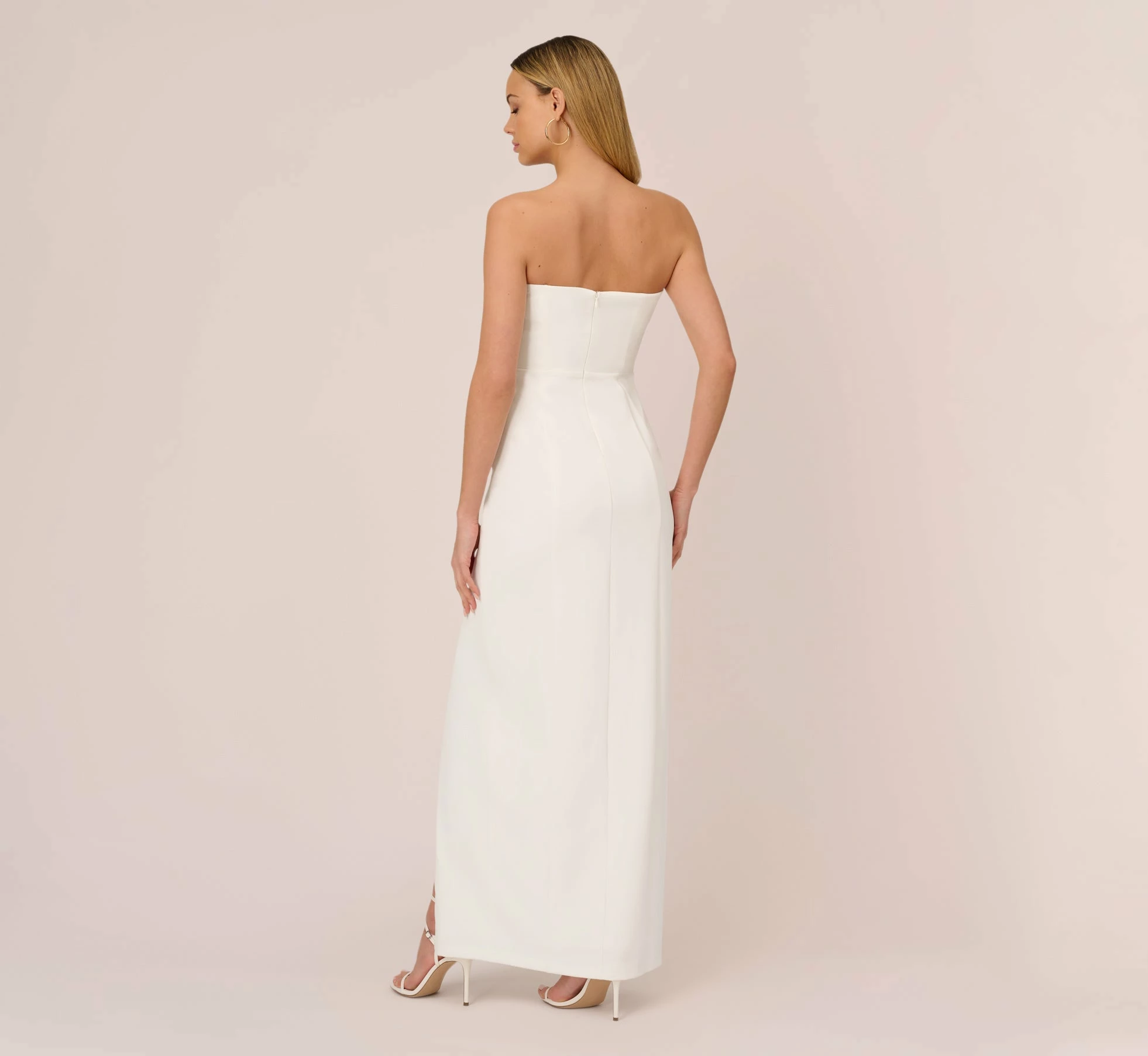 Streamlined and sexy, with elegant satin notches and a flowing floor-length skirt. Accented with a sculptural, modern neckline and chic slit at the front.
