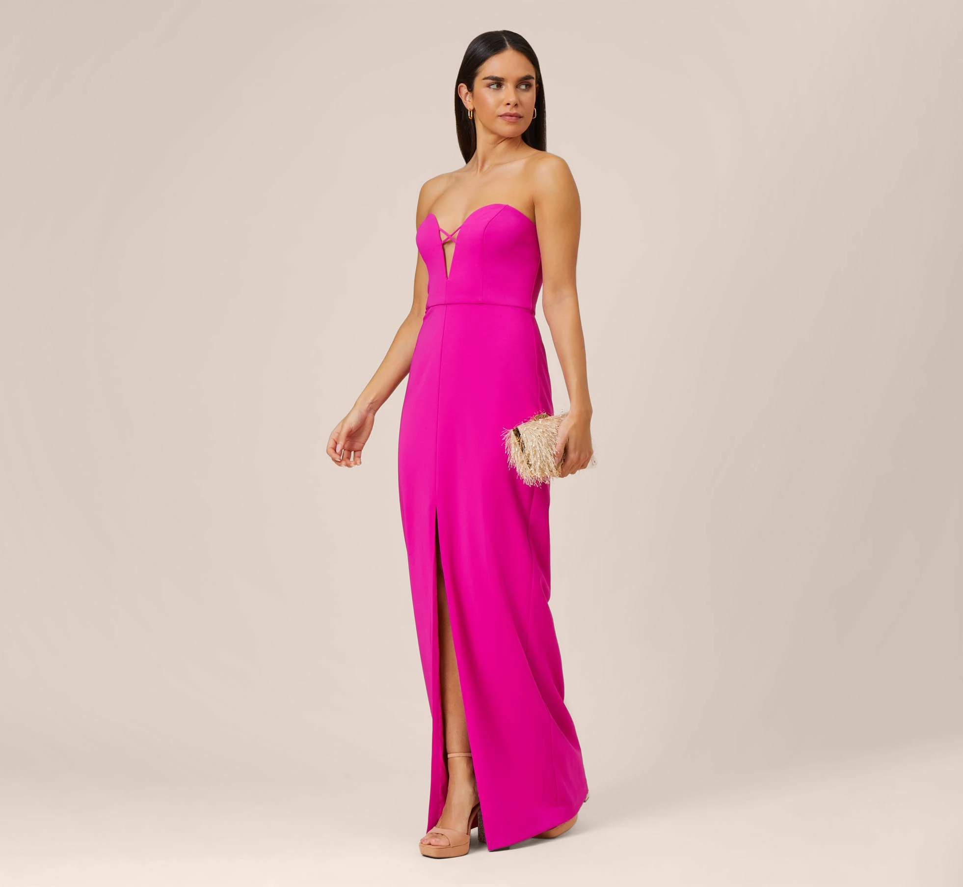 Striking with its sleek lines, this column dress is fashioned from a stretch woven crepe with a body-hugging fit. Defined by a gorgeously modern plunging sweetheart neckline with crisscross detail and finished with a leg-revealing slit opening for an undeniable sense of sexiness. Sleek back zipper with hook and eye closure.