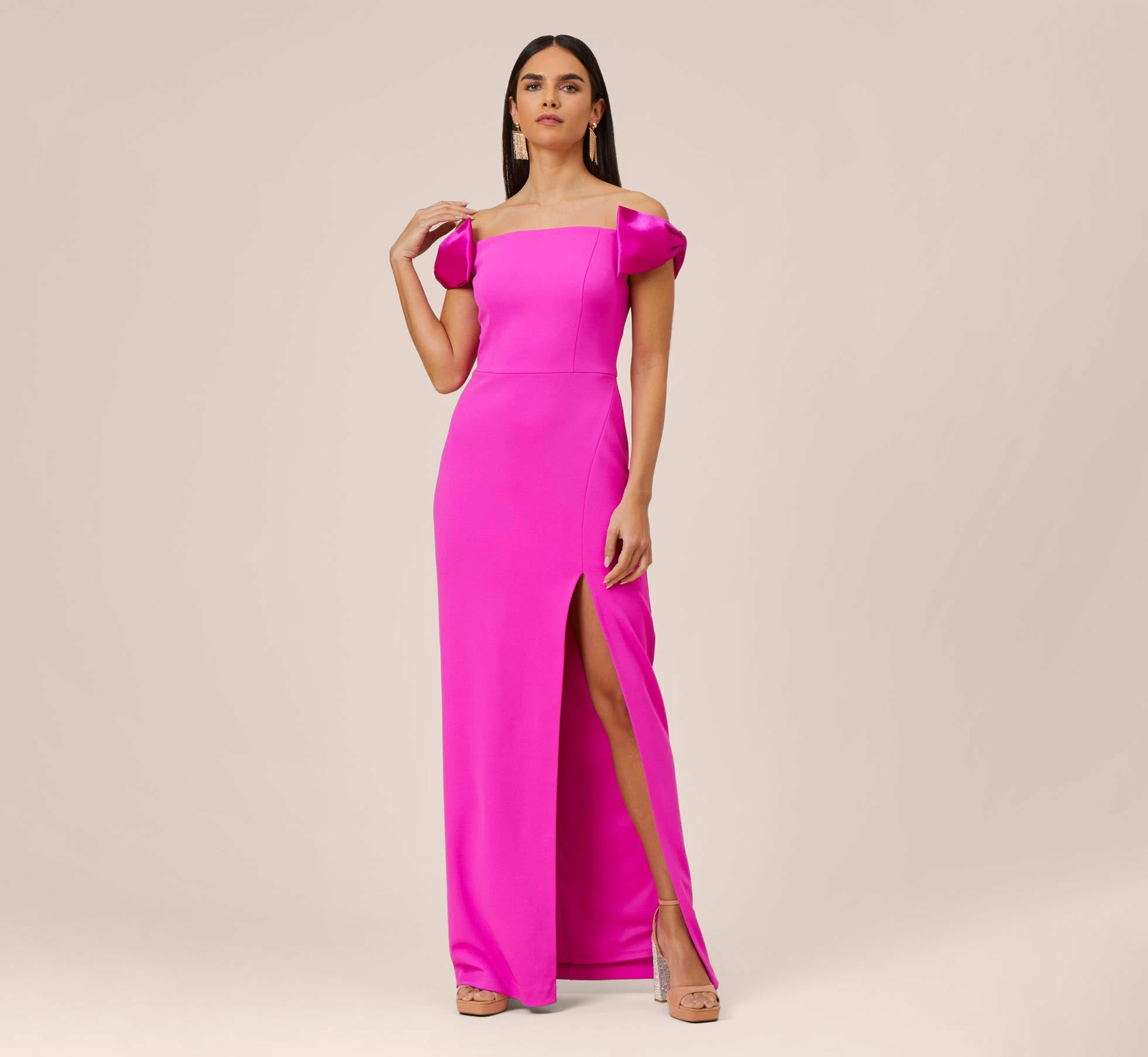Classic and beautifully draped in a stretchy knit crepe, our glamorous off the shoulder column dress skims your frame in all the right places. Featuring whimsical satin bow off the shoulder details a deep slit. Finished with front seamed detailing for a sleek and structured fit. Back zipper with hook and eye closure. A standout style for prom, wedding receptions and black-tie galas. Poly knit lining.