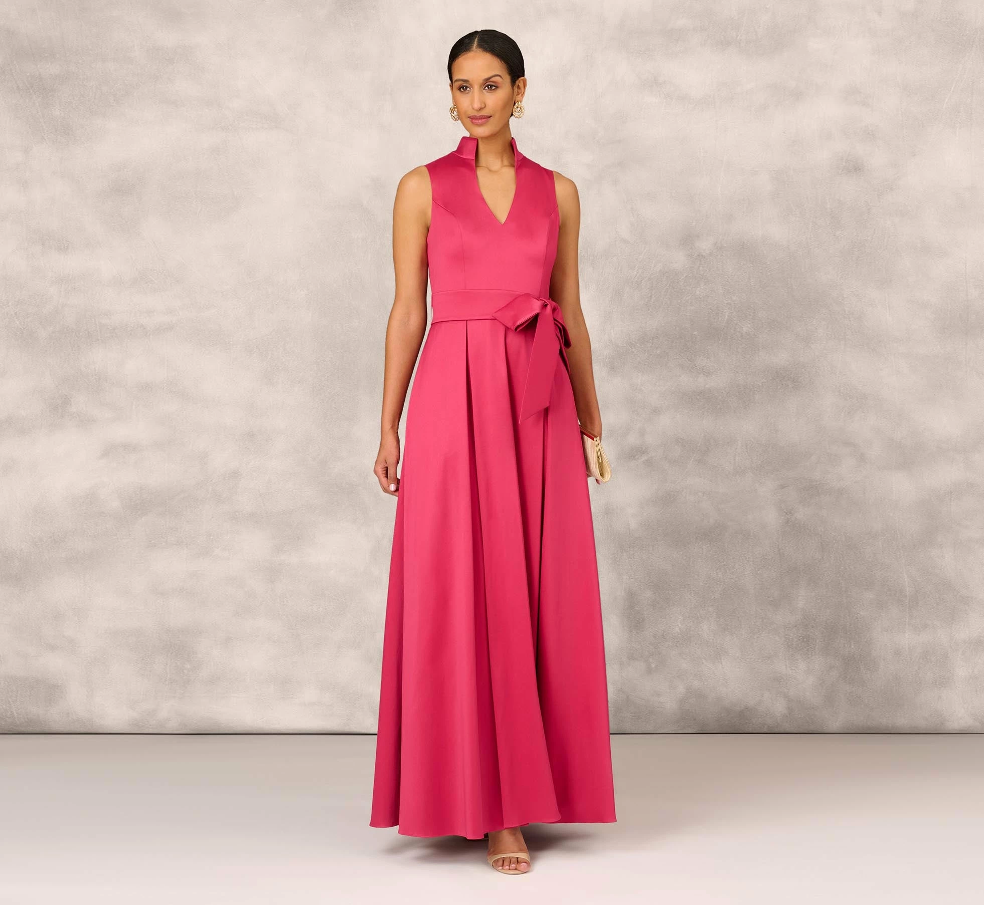 Expertly tailored and simply elegant, this classic ball gown is crafted of a substantial stretch Mikado with a lustrous finish and beautiful drape. This spectacular style has a dramatic stand collar and deep V-neck. Designed with bodice princess seaming and inverted box pleats on the skirt for added drama and a ball gown sweep. Finished with self-tie sash. Back zipper with hook and eye closure. Poly stretch lining.