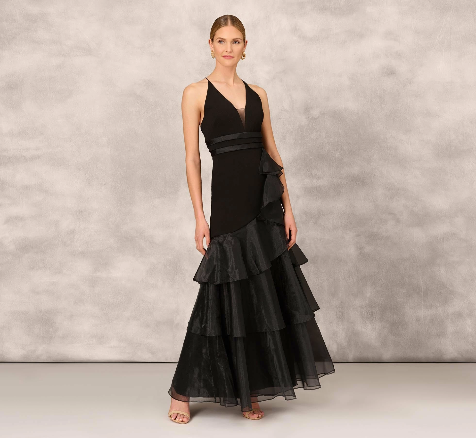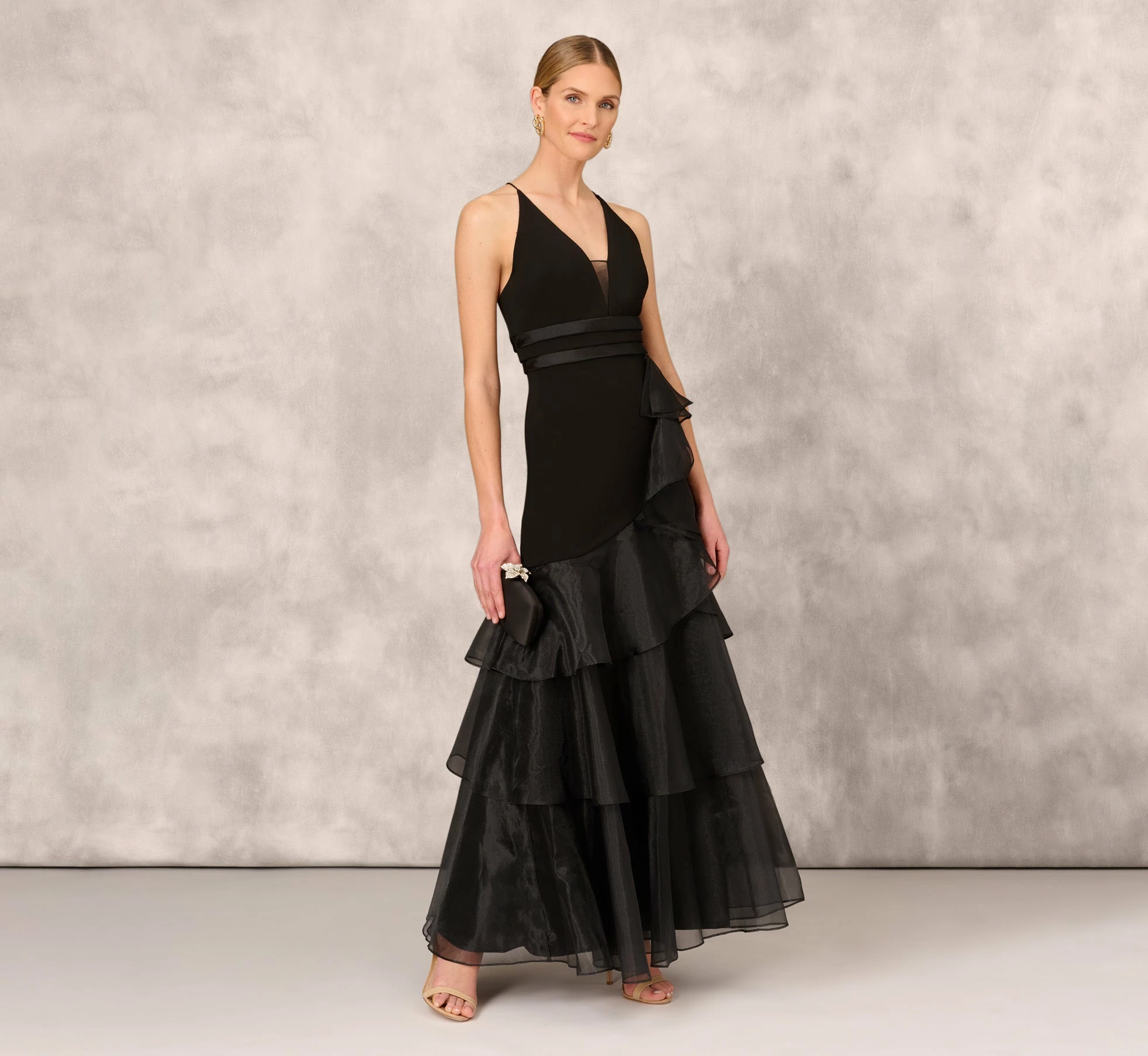 Exude maximum glamour when you opt for this beautiful tiered trumpet dress. This gorgeous formal gown features a plunging neckline with sheer panel, and an eye-catching tiered skirt with cascading ruffles designed to the draw the eye. Other details include cross-back straps and a back zipper closure. All in all, this striking dress brings the drama. Combine this jaw-dropping evening dress with a beaded clutch and strappy heels to steal the show.