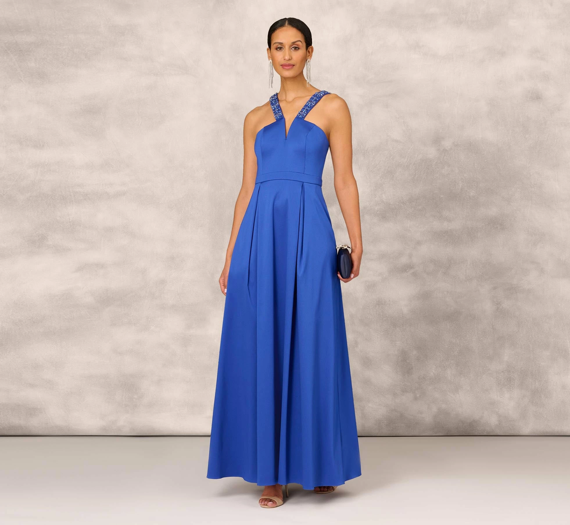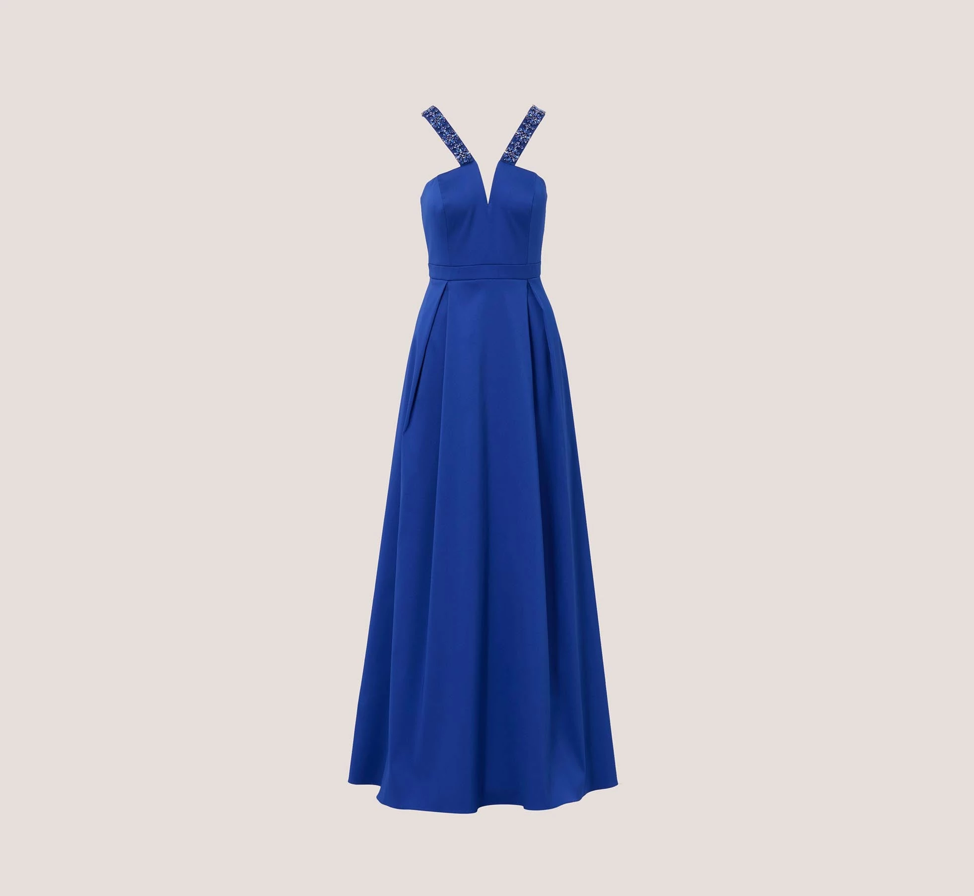 It’s all about the details in this luxe mikado gown. This formal dress features a fitted bodice with a v-neckline that is framed by slanting straps and a full ball gown skirt with pockets. Beautiful jeweled and beaded flowers adorn the straps of the gown from front to back for a little sparkle.Complete this look with your favorite heels and a sequin clutch.