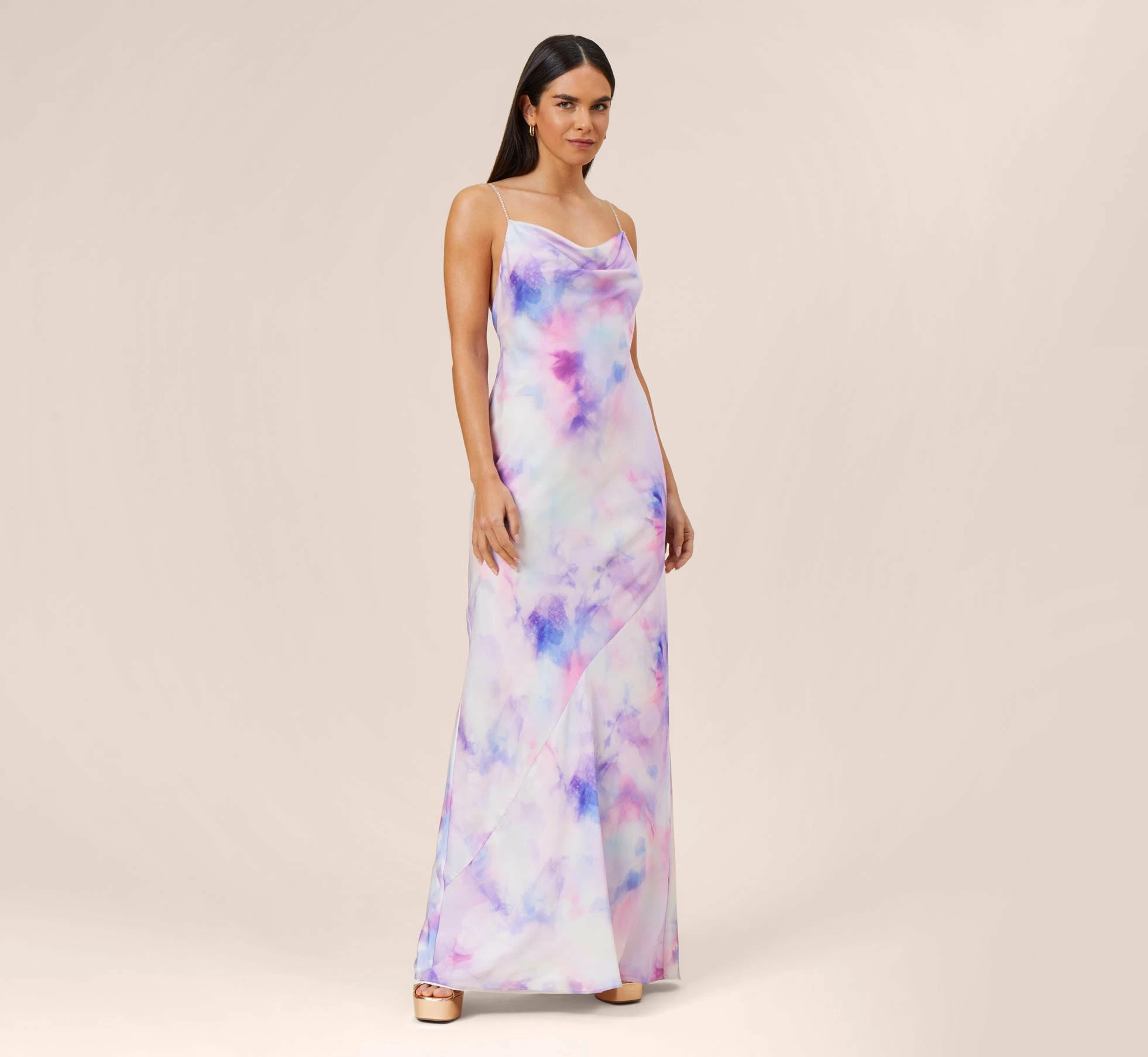 Striking both coming and going, this column dress is crafted from a buttery-soft woven stretch satin charmeuse in a watercolor pattern and features a flattering cowl neckline. This bias-cut dress skims the body. The beaded straps and low back add a sense of sexiness. Sleek zipper with hook-and-eye closure. Amp up your look at prom, wedding celebrations and black-tie galas.